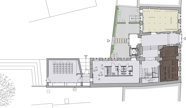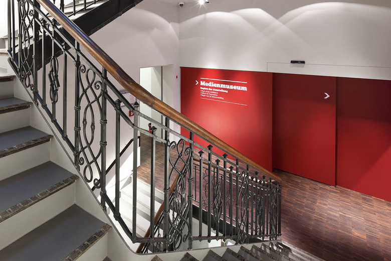Diese münden abschließend in ein Cafe. Die Ausstellung wird ergänzt durch Wechselausstellung und Vortragsraum und Gastronomie im Erdgeschoss, Bibliothek im Obergeschoss und Verwaltungs- und Archivräume im Dachgeschoss.