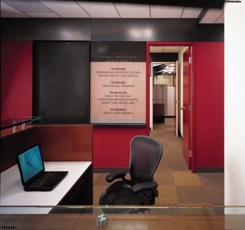The core and communal functions are housed in free standing volumes which are partially clad in gyp. board and painted a bright red further enlivening the work environment. Sandblasted clerestories and black steel bands cap off the volumes. The red wall is first visible at the reception desk, acting as a brilliant backdrop to the mission statement silk screened on Plexiglas - reminding all visitors of the important work done by Planned Parenthood.