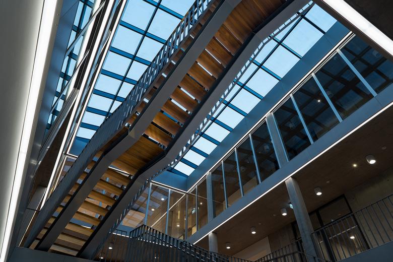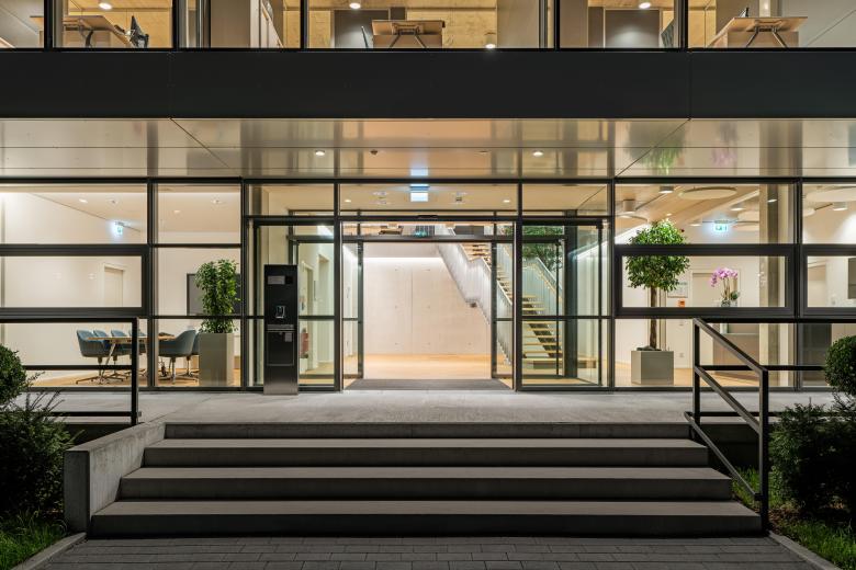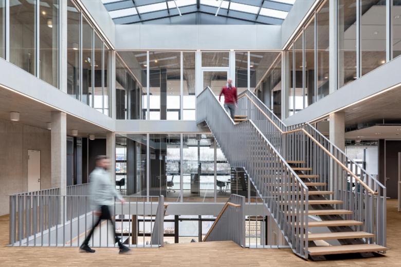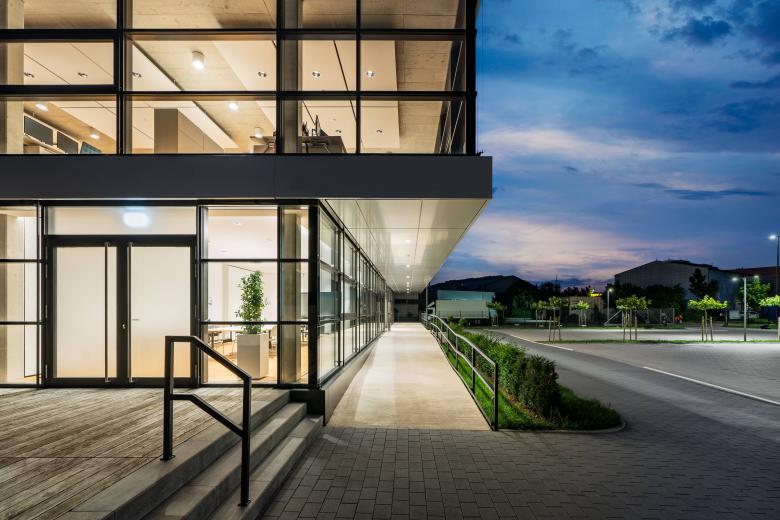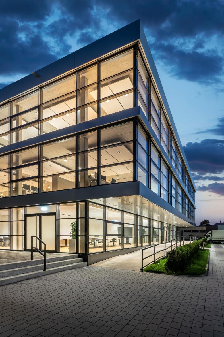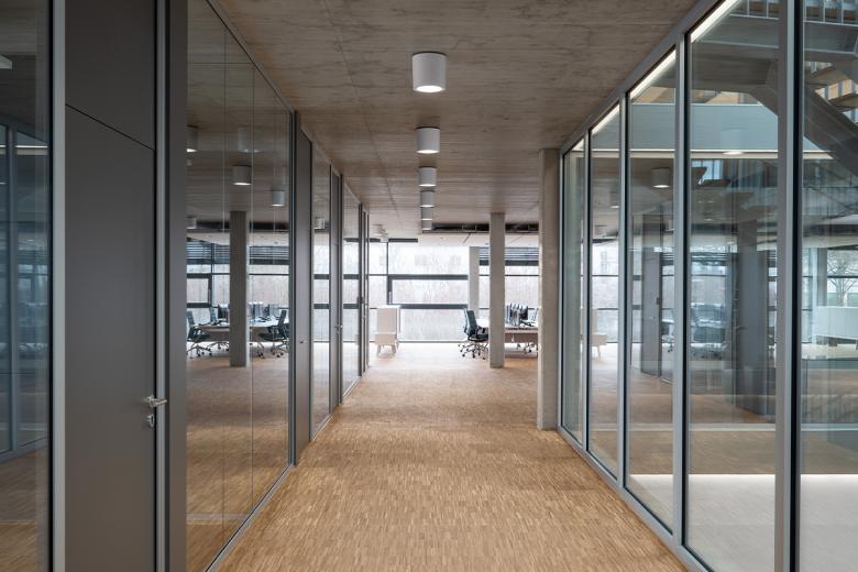 Hinsichtlich seiner Funktionalität und Bauästhetik zeigt der dreigeschossige Baukörper klare Bezüge zum klassischen Bauhausstil. Eine offene Raumanmutung auf rund 3.000 Quadratmetern Bruttogeschossfläche entstand durch natürliches Tageslicht und eine umfassende bauliche Transparenz. Außen ist eine Pfosten-Riegelfassade mit Dreifachverglasung zur Ausführung gekommen. In Kombination mit einem lichtdurchlässigen Dachabschluss über dem innen liegenden Atrium erschließen freie Treppen die einzelnen Ebenen.