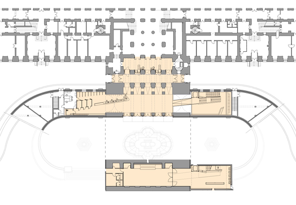 Die neue Eingangssituation stellt eine Verknüpfung zwischen historischer Substanz und zeitgemäßer Architektur her. Zusätzliche Tore in der Rampe erzeugen Geradlinigkeit, ermöglichen dadurch eine orientierungsfreundliche und erlebnisreiche Raumabfolge.