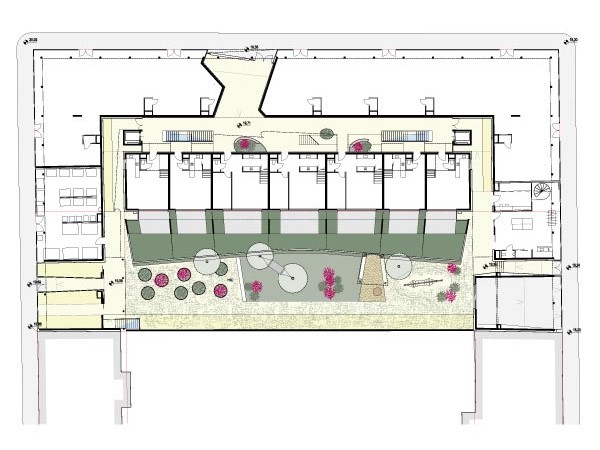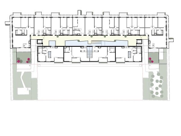 Das urbane, der Stadt zugewandte „Stadthaus“ und das „Gartenhaus“ welches die Ruhelage und den großzügigen nachbarlichen Grünbereich nutzt, werden beide durch eine attraktive Innenhalle erschlossen. Erschließungsgänge werden durch Erweiterungen und visuelle Verknüpfungen zu Orten der Begegnung und Kommunikation. Kinderwägen und Kinderfahrräder können geschossweise in eigenen Boxen in unmittelbarer Nähe zur Wohnung abgestellt werden. Aneignungs- und Grünzonen sollen von den Bewohnern in Besitz genommen werden und fördern die Kommunikation untereinander.