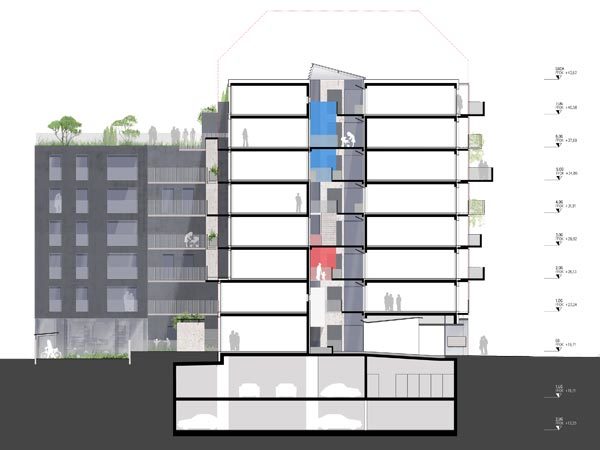 Über dem Erdgeschoss entwickelt sich eine mehrschichtige Fassade: umlaufende, wohnungsbezogene Freibereiche werden durch eine durchlässige, membranartige Metallstruktur aus Stäben unterschiedlicher Stärke und transluzenten Geländern begrenzt. Die Membran wirkt als Filter zur Stadt. Sie wird von schubladenartigen Balkonen unterschiedlicher Größe durchdrungen, welche gemeinsam mit den seitlichen Begrünungen die dritte Fassadenebene bilden.