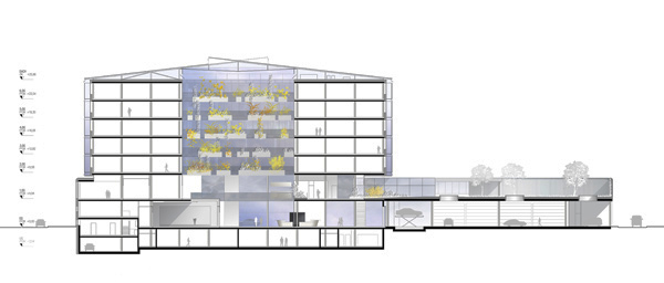 Die Hochgarage verlängert die bestehende Park&Ride Anlage entlang der „Tangente“. Sie ist durch eine zwischengeschaltete „Fuge“ als eigenständiger Baukörper wahrnehmbar und bildet den Sockel für den aufgesetzten Helikopterlandeplatz und das Hangargebäude.