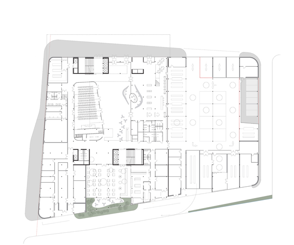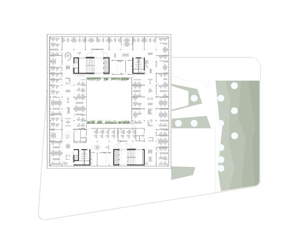 Ein 2-geschossiger Sockel bildet die Basis welcher von einem 5-geschossigen Bürobaukörper überlagert wird.