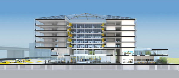 Die Hochgarage und die Zentrale begrenzen den neuen ÖAMTC Vorplatz. Dieser dient als Vorfahrt vor die Zentrale und als Einfahrt in das Firmengelände. Die vorgelagerten Parkplätze sind auf kurzem Weg erreichbar und werden im Erdgeschoss der Hochgarage als überdeckte Stellplätze weitergeführt.