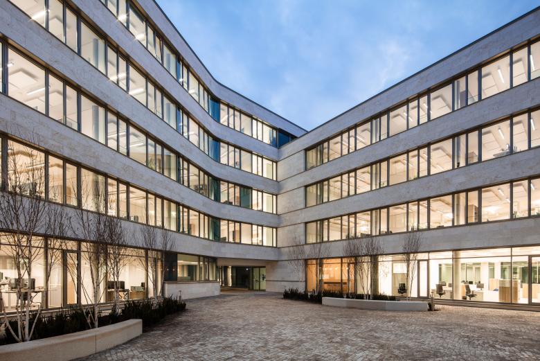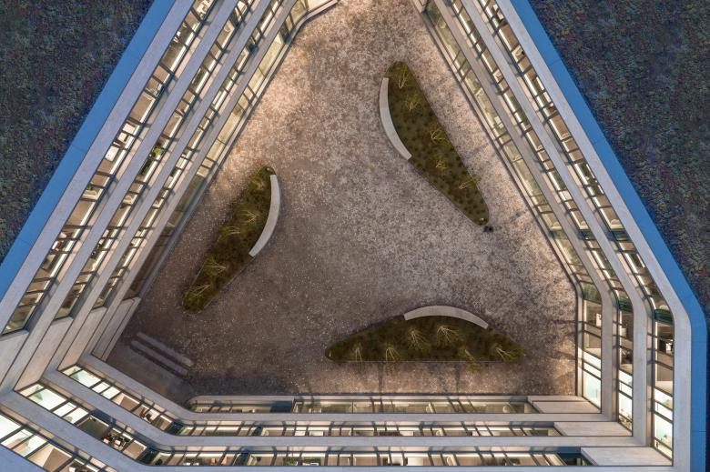 Ziel war es, ein wertiges, offen angelegtes Gebäude mit zeitgemäßen Arbeitswelten zu entwickeln, in dem sich die 460 Mitarbeiter und ihre Kunden willkommen fühlen und gerne aufhalten. Der um einen großzügigen Innenhof entworfene, dreieckige Baukörper reagiert mit seinen unterschiedlich hohen und leicht geschwungenen Längsseiten sensibel auf die Gebäude in der Nachbarschaft.