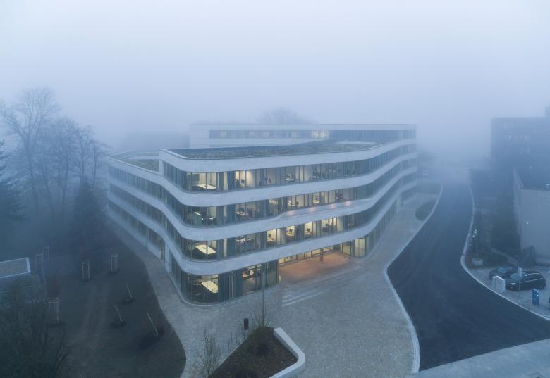 Durch das in sich geschlossene Gebäude entstehen im Inneren sehr flexibel nutzbare lichtdurchflutete Flächen, die sich leicht an wechselnde Anforderungen der modernen Arbeitswelt anpassen lassen. Warme helle Materialien wie z.B. Holz im Innenbereich harmonieren mit dem in der Fassade verwendeten regionalen Naturstein Kelheimer Auerkalk.