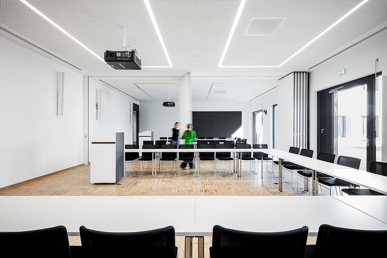 Im Konferenzbereich finden größere interne und externe Veranstaltungen statt. Bei Bedarf können die beiden Konferenzräume zu einem großen Raum miteinander verbunden werden. Dem Konferenzbereich ist eine Sanitäreinheit mit angemessener Größe angegliedert.