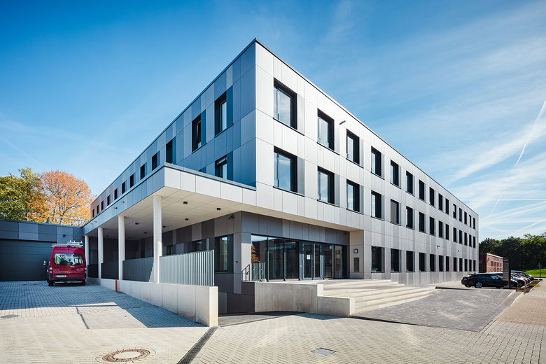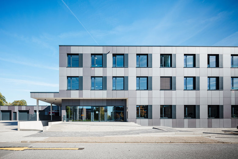 Für die repräsentative Fassade wurden drei unterschiedlich farbige, nichttransparente Faser-Zement-Platten ausgewählt. Das Fassadenkonzept garantiert niedrige Wartungs- und Instandhaltungskosten und wurde auf das Raumklimakonzept hin abgestimmt. Die Fenster sind mit einem schmalen hohen Lüftungsflügel (Nachtlüftungsflügel) ausgestattet und sorgen ebenfalls für ein angenehmes Raumklima.