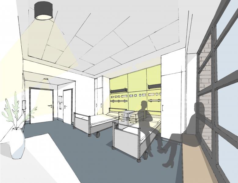 Der Neubau greift die Formensprache des denkmalgeschützten „Höger-Baus" auf, indem er sich auf die typischen Rechteckformen beschränkt. Das Grundrisskonzept sieht eine intuitive und logische Orientierung für Patienten und Besucher sowie eine sinnvolle Verteilung der Funktionsstellen unter Berücksichtigung kurzer Wegeführungen und betrieblich funktionaler Abläufe vor. Entgegen der kompakt gegliederten Basisgeschosse, wird die Gebäudekubatur in den aufgehenden Ebenen in eine verschobene Doppelkammstruktur aufgelöst. Hierdurch erhalten alle Patientenzimmer Ausblicke in die Umgebung und gleichzeitig wird der Baukörper horizontal und vertikal gestaffelt.
