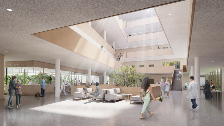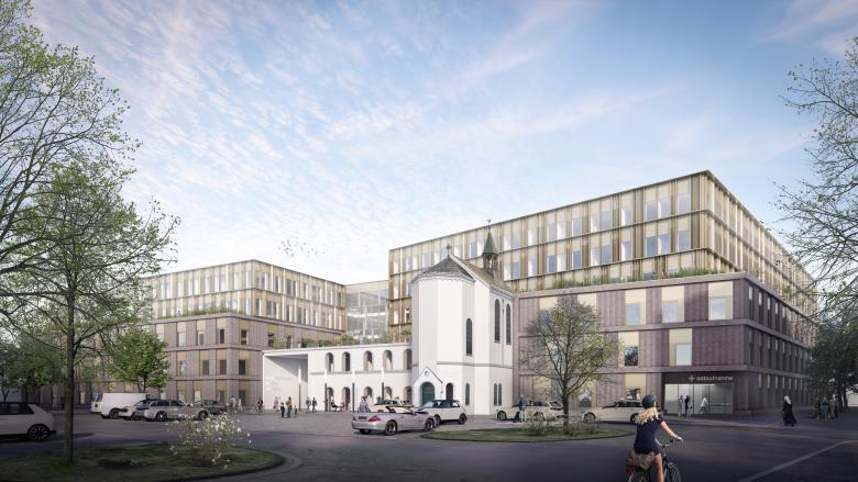 Der Neubau mit einer Bruttogeschossfläche von 50.000 Quadratmetern wird in vier Bauabschnitten über einen Zeitraum von zehn Jahren realisiert. Der Entwurf sieht eine moderne zentrale Notaufnahme, die Bündelung von Intensiv- und OP-Abteilungen sowie eine Gesamtkapazität von 450 Planbetten vor. Ergänzt wird die stationäre Versorgung durch ein zentrales ambulantes Interventionszentrum.