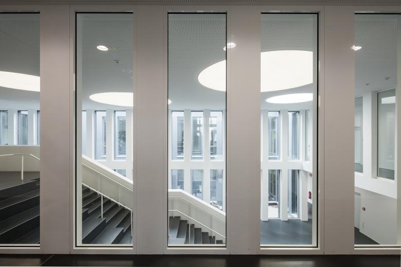 Die bestehenden Gebäude der Integrierten Gesamtschule Rheinzabern wurden um einen zweigeschossigen Neubau erweitert. Neben den naturwissenschaftlichen Fachklassen mit Sammlungsräumen, bildet das zentrale Foyer mit vielfältigen Nutzungsmöglichkeiten eine lebendige Mitte für Schüler und Lehrer. Eine breite Treppenanlage mit Sitzstufen verbindet die beiden Geschosse und wird zum belebenden und kommunikativen Element.