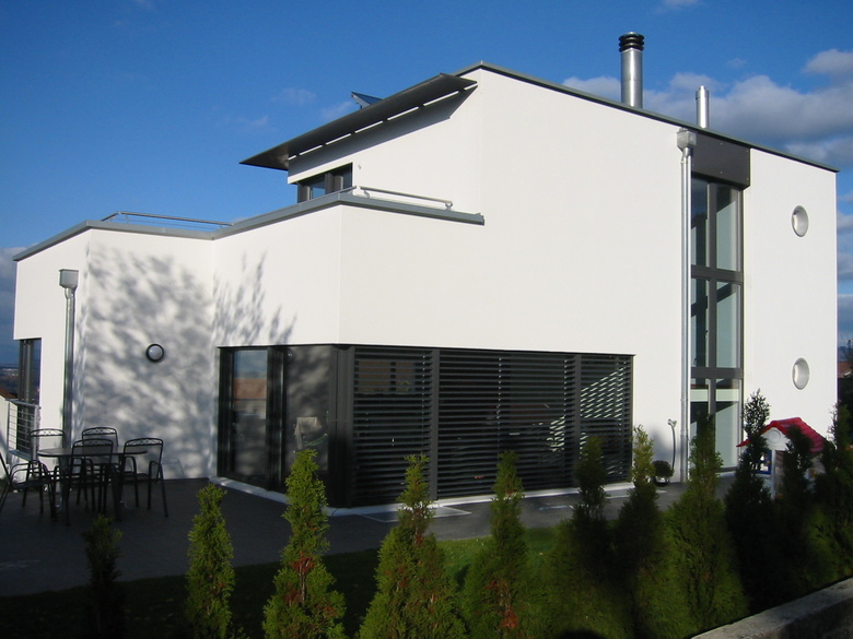Sehr kubisch gehalten, in Weiss- und Anthrazittönen noch einmal die 1990er Jahre aufleben lassend, wurde die Familie Pfanner ein wohlkonfektioniertes Kleinod geschaffen.