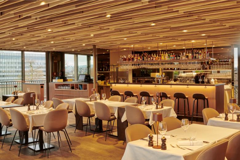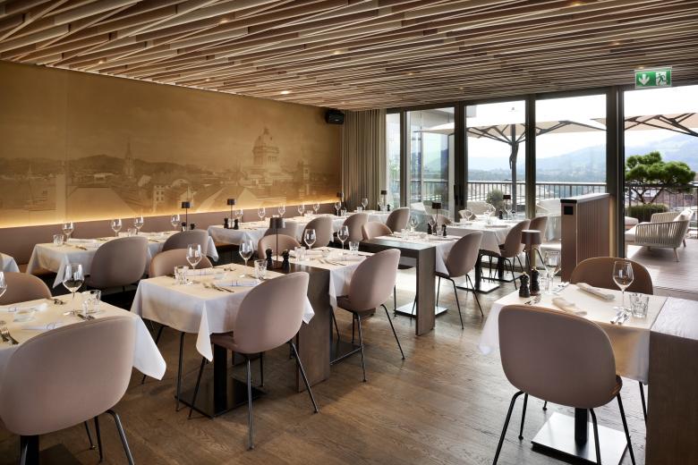 Das auf dem Dach des Loeb-Warenhauses gelegene Nido Ristorante besticht durch sein architektonisches Volumen und seine einzigartige Terrasse mit Blick auf die Stadt und die Alpen. Der Bronzeton der Gestaltung wurde bewusst gewählt, um eine harmonische Verbindung zur Umgebung und dem Sandstein der Stadt herzustellen. Das Design inszeniert einen subtilen Dialog zwischen moderner Architektur und der urbanen Landschaft.
