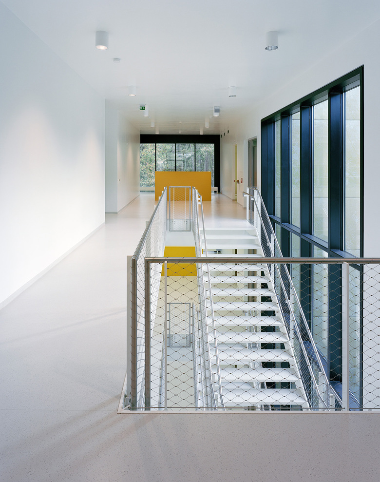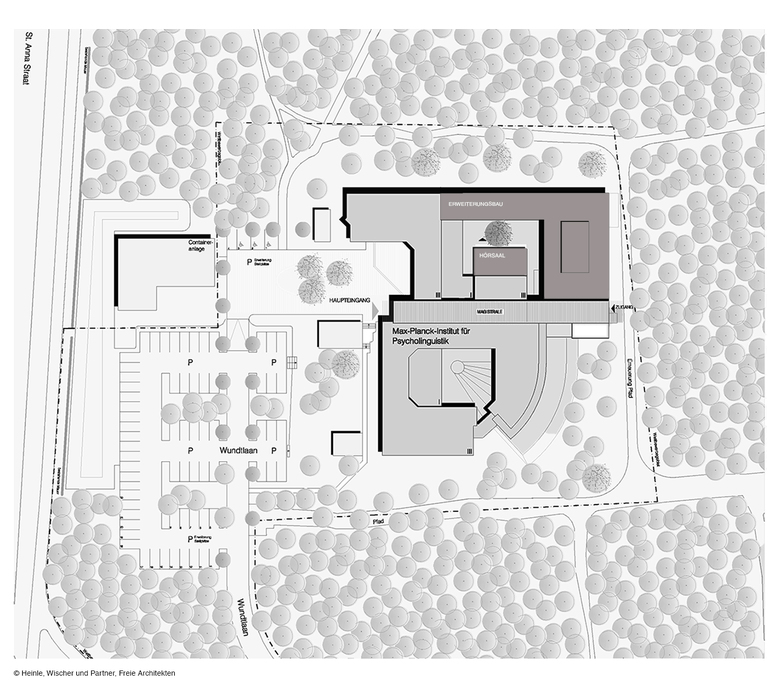 Städtebaulich komplettiert der L-förmige Anbau die heterogene Grundrissstruktur des Max-Planck-Instituts für Psycholinguistik um einen weiteren Gebäudeflügel mit drei Etagen. Das Konstruktions-und Ausbauraster basiert auf dem durchgängigen Achsmaß von 1,20m für Labore und Büros. Auf diesem Raster konnten unterschiedliche Raumkonstellationen in den verschiedenen Ebenen realisiert werden; Experimentallabore und ein Hörsaal für Institutszwecke im Erdgeschoss, Büroräume für Wissenschaftler in den Obergeschossen und molekularbiologische Laboratorien im 2. OG.