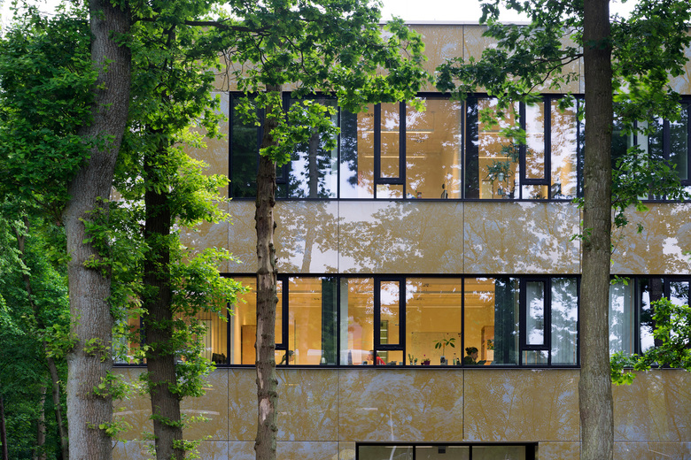 Ein wesentliches Charakteristikum des Neubaus sind die opaken Wandflächen, die durch rückseitig beschichtete Glaspaneele das Licht- und Schattenspiel der Umgebung reflektieren. Eigens für dieses Bauvorhaben wurden sämtliche Glasplatten in einem Siebdruckverfahren seriell mit Grafiken abstrahierter Pflanzenmotive bedruckt. Durch Reflexionen der umgebenden Bäume in den spiegelnden Fassadenpaneelen und in den Fenstern wird ein Zusammenspiel mit der umgebenden waldartigen Parklandschaft erreicht.