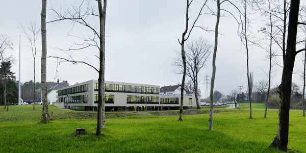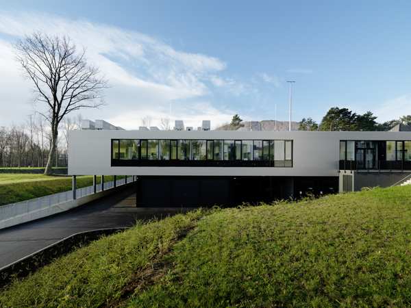 Situated in the midst of industrial, commercial and residential block buildings, the contrast with the surroundings visualises those qualities held to be synonymous with the subject of water – specifically drinking water. Thanks to its location, the new building complex forms a unit with the existing operational and workshop buildings, connected by a generous and yet inviting square available for a variety of different uses. The access situation to the premises is essentially unchanged, the straight path continues to stand for an open-armed reception at the Andritz site. Accompanied by attractive landscaping are the 100 parking spaces for visitors and staff and the driveway to the 50 covered parking spaces below the new building. The building concept is based on the idea of creating a harmonious ensemble with the existing complex by following its building lines. The functional areas of the two-storey operational building and the single-storey laboratory wing are combined in a compact structure positioned at the edge of the site in order to lend an aspect of lightness and floating to the whole. In addition to a clear-cut definition of the square-side main entrance, the laboratory is also given separate access, and thus not only retains its independence and function, but also, being aligned to the car park, contributes to a clear arrangement for customers. A key aspect of the floor plan concept is the layout of the event hall, that is inserted between the laboratory and operational areas. This ensures that the unit can both operate autonomously and also that adjoining areas can be connected as required. A flexible use of space and the interplay of inside and outside – with the aid of open and closed atria – create the ideal conditions for a pleasant indoor and working atmosphere and reflect a modern corporate philosophy.