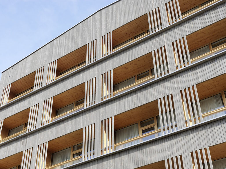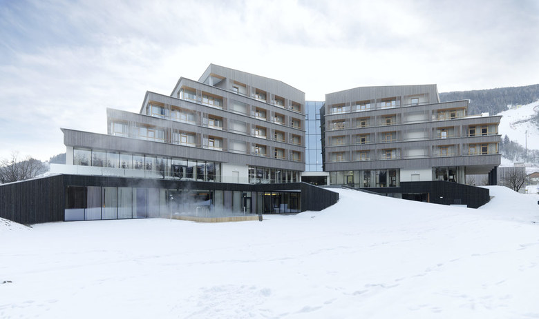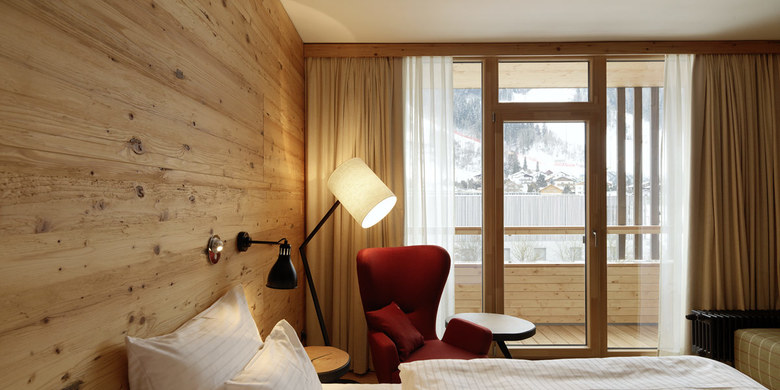 Während der konstruktive Kern des Bauwerks aus Stahlbetonschoten bzw. Betondecken besteht, wurde die außenliegende Schicht der Loggien, ebenso wie die von innen sichtbare Decke des Atriums, aus Brettsperrholz konstruiert. Aus Holz sind auch Fenster und Türen, Böden und Brüstungen, die Innenansichten der Loggien und die Fassade. Letztere, eine vertikale, lasierte Fichtenholzschalung, die teilweise lamellenartig als Blickschutz vor die Loggien gezogen wurde, vermag mehrerlei: Die Größe des Hotels wird durch die Differenziertheit der Fassade relativiert, das Holz stellt nicht nur einen Bezug zum benachbarten „Congress Schladming“, sondern auch zur Landschaft und zur Region an sich her und durch die Sachlichkeit seiner gestalterischen Ausformulierung wird ein urbaner Anspruch formuliert, welcher in der Stadt Schladming ein wichtiges Zeichen setzt.