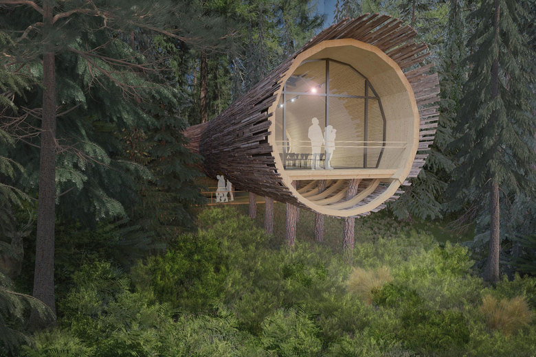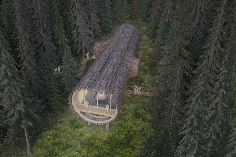 Der „Baumstamm“ liegt nur optisch auf dem Waldboden auf. Das eigentliche Waldzimmer steht auf Lärchenholzpfählen und berührt den Waldboden so nicht. Der Hohlraum bietet der vielfältigen Fauna Unterschlupf und Geborgenheit. Einzig der kleine Lagerraum, direkt neben dem Zugangssteg, ist für die Verbindung zur „Mutter Erde“. Sie kann unter anderem eine autarke Energie- und Entsorgungsstation beherbergen.