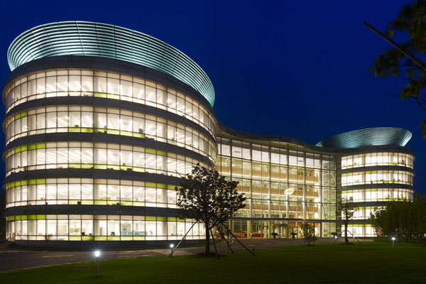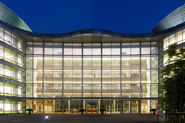 Das Gebäude ist erdbebensicher als Stahlbetonskelettbau ausgeführt. Als auffälligstes Zeichen des Feng-Shui-Einflusses weist der gesamte Baukörper keinen rechten Winkel auf. Mit fünf Ober- und einem Untergeschoss verfügt der Neubau über eine Fläche von 23.000 m² BGF für ca. 500 Arbeitsplätze. Dabei sorgen ein durchgängiges Konstruktionsraster von 5.50 m und ein Fassadenraster von 2.75 m für größtmögliche Flexibilität sowie variable Büro- und Laborlayouts.