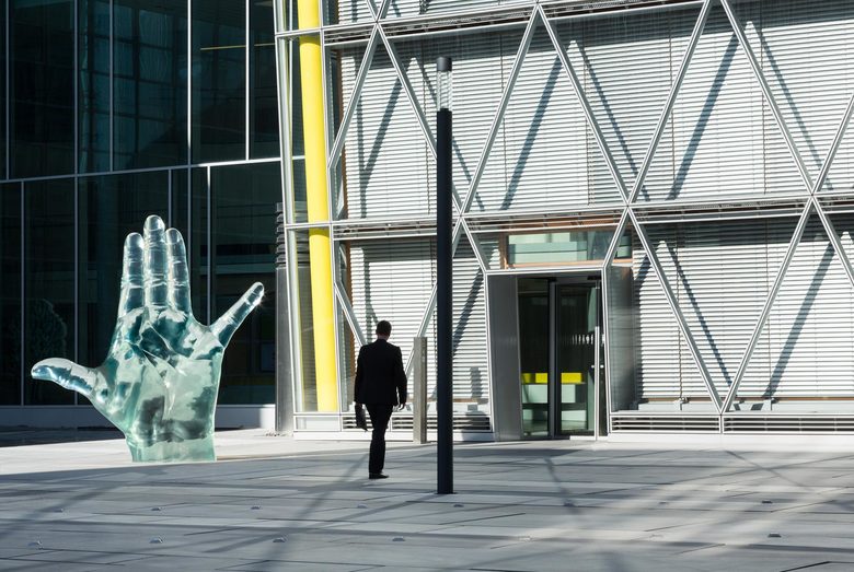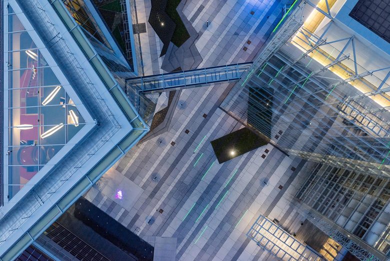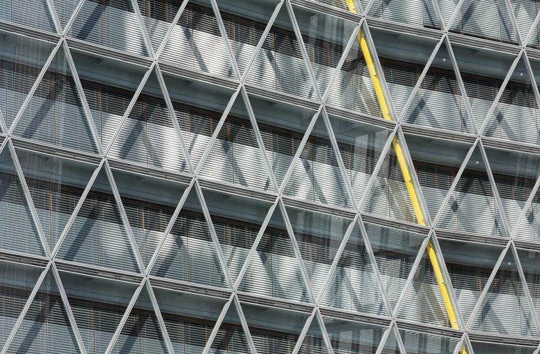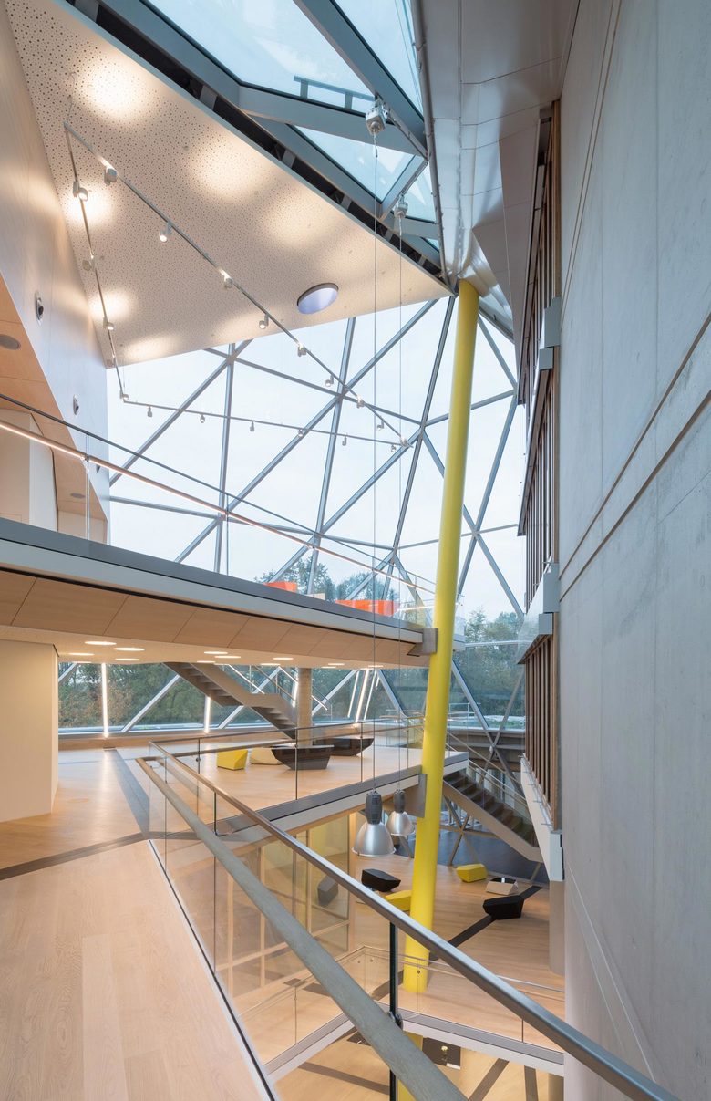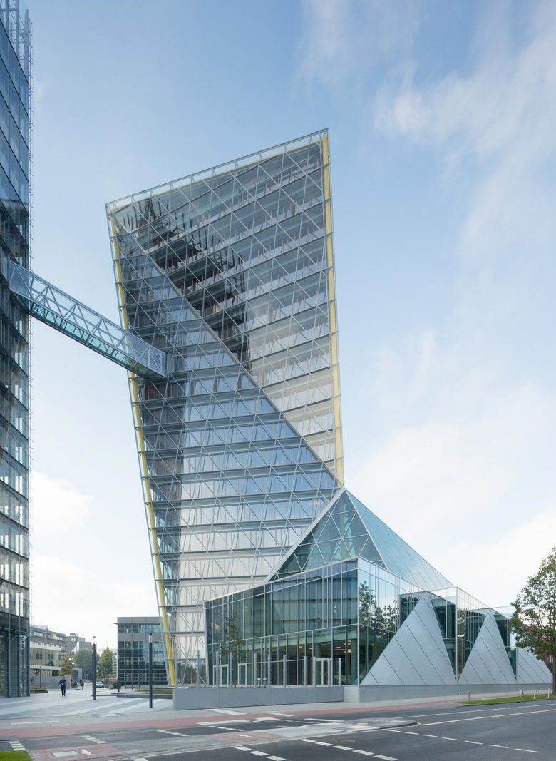 Fassade – 6.000 Quadratmeter Glasfassade als Doppelfassade mit Klimapufferzone umhüllen den Kristall. Die inneren Fassaden sind mit Dreifachverglasung ausgestattet. Gemäß der Gebäudeform unterscheiden sich die Geometrien der Fassaden der vier unterschiedlichen Gebäudeansichten. Von den über 600 Fassadenelementen weisen 480 unterschiedliche Geometrien aus. Die Außenfassade folgt dem Dreiecksraster, das der gesamten Gebäudegeometrie zugrunde liegt, während die Innenfassade orthogonal gegliedert ist. Zwischen Außen- und Innenfassade liegt die windgeschützte Klimapufferzone, aus der nach Nutzerwunsch bei geöffneten Innenfenstern Frischluft in die Büroräume gelangt.