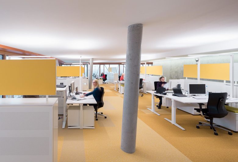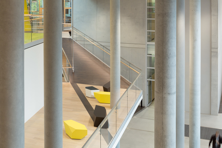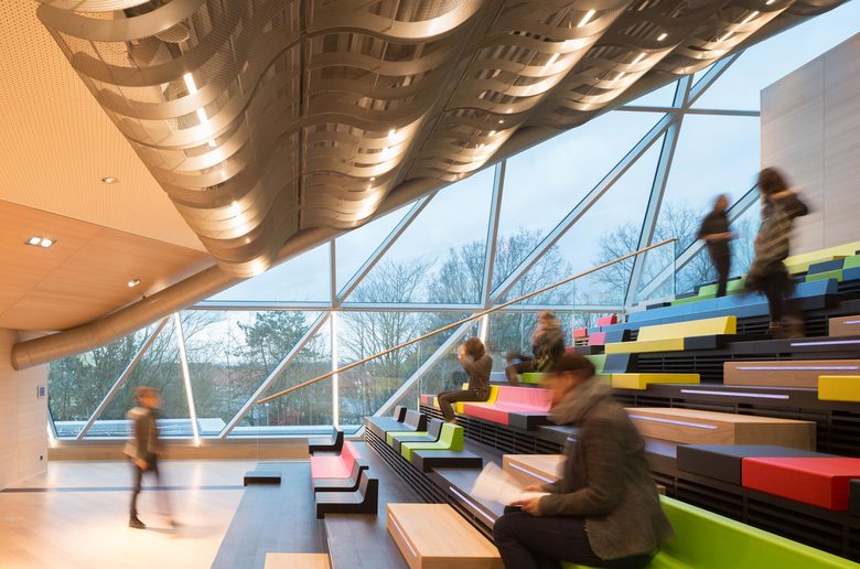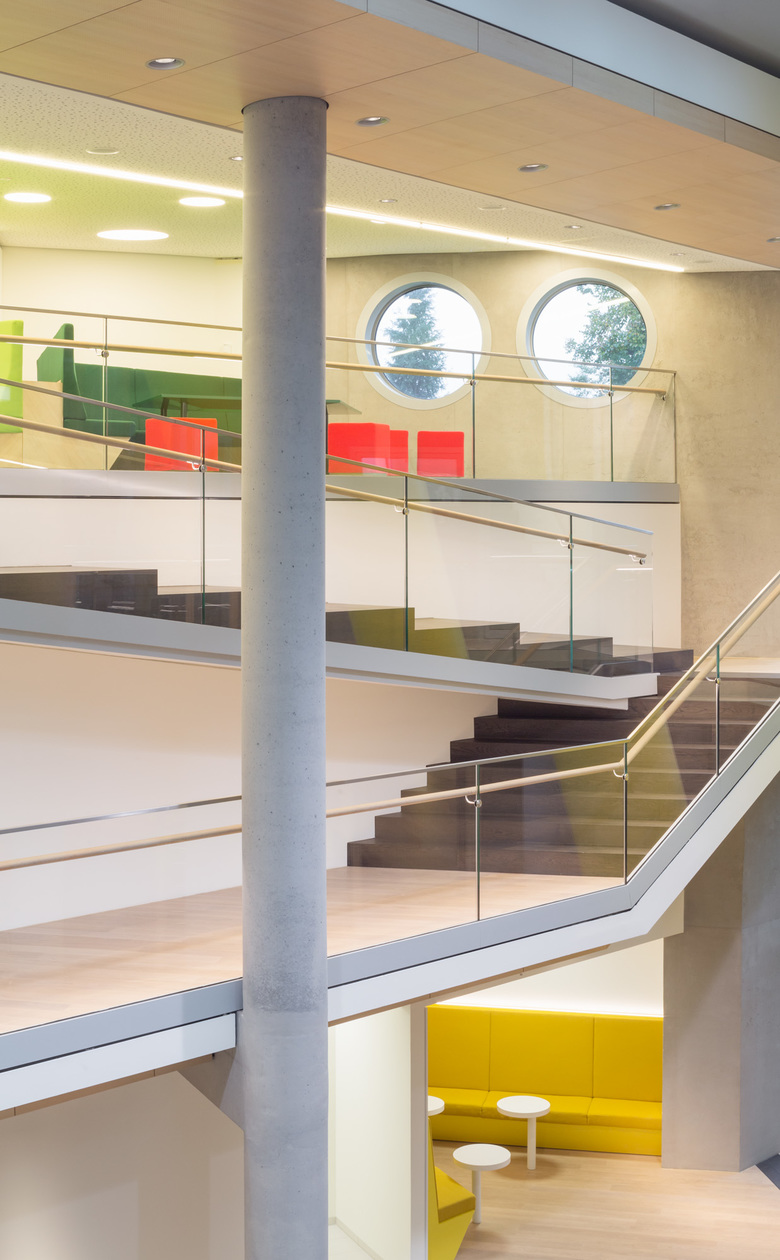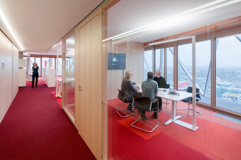 Die gläserne Bauskulptur schraubt sich schräg in die Höhe und verbindet sich auf der 11. Etage mit dem älteren Nachbarbau durch eine Ganzglasbrücke. Während im Sockelgebäude die zahlreichen Veranstaltungs- und Schulungsflächen untergebracht sind, befinden sich auf den Etagen 2 bis 14 die „Open-Space“-Büroflächen mit 450 Arbeitsplätzen. In den drei obersten Geschossen in der 15., 16. und 17. Etage bietet die Sky Lounge neben einem weiten Blick über Münster den passenden Rahmen für Konferenzen und kleine Empfänge. Im gesamten Gebäude setzt sich die expressive Architektursprache bis in die Innenarchitektur, die Möblierung sowie die Farbgebung und die Kunst am Bau fort.