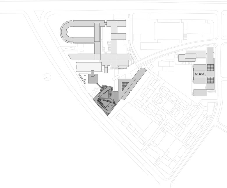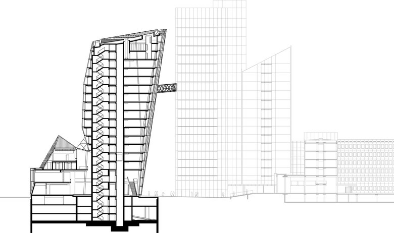Statik – Das bis zu viergeschossige Basisbauwerk mit seiner unregelmäßigen Geometrie wurde in Stahlbetonbauweise mit weit gespannten Unter- und Überzugsdecken und teilweise schräg stehenden aussteifenden Wänden konzipiert. Die Tragstruktur des Turms besteht aus einem Stahlbetonskelett mit ebenen Flachdecken, Stützen und Kernen.