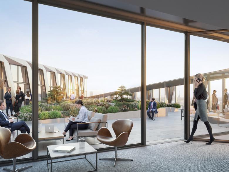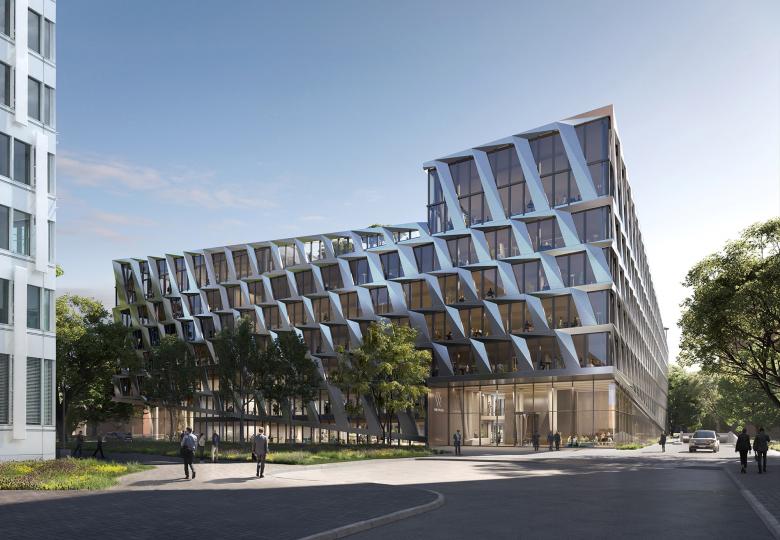 Die zweigeschossige Anhebung der Gebäudeecken öffnet das ONE PLAZA zu allen Seiten. Es ergeben sich drei großzügige Eingangssituationen, welche die Erdgeschosszone mit dem Quartier vernetzen. Gleichzeitig entsteht durch den Höhenversatz im oberen Fassadenbereich eine spannungsvoll geformte Dachlandschaft mit windgeschützten Gärten für die Büromieter. „Die schräg zulaufende Vorhangfassade mit ihren vertikalen, geschickt gefalteten Aluminium-Paneelen unterstützt die Dynamik und Leichtigkeit des Gesamtgebäudes und erzeugt ein spannungsvolles Spiel aus Licht und Schatten“, erläutert Volker Weuthen, projektverantwortlicher HPP Senior Partner.