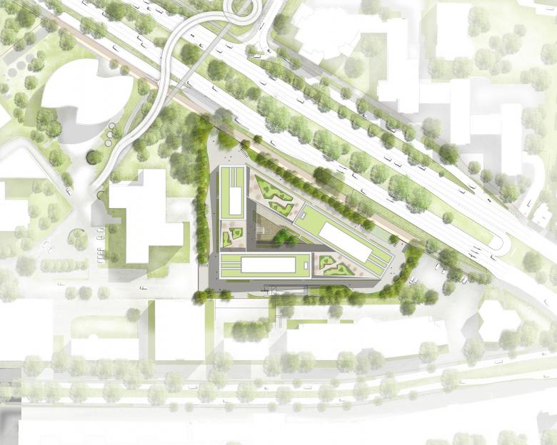 Durch die Komposition aus drei Gebäudeflügeln, die sich um einen dreieckigen Innenhof gruppieren, entsteht ein skulpturaler Baukörper mit markanter Architektur und hohem Wiedererkennungswert. Die dynamische Formensprache wird gestalterisch konsistent in allen Dimensionen des Gebäudes bis hin zur Fassadengestaltung umgesetzt.