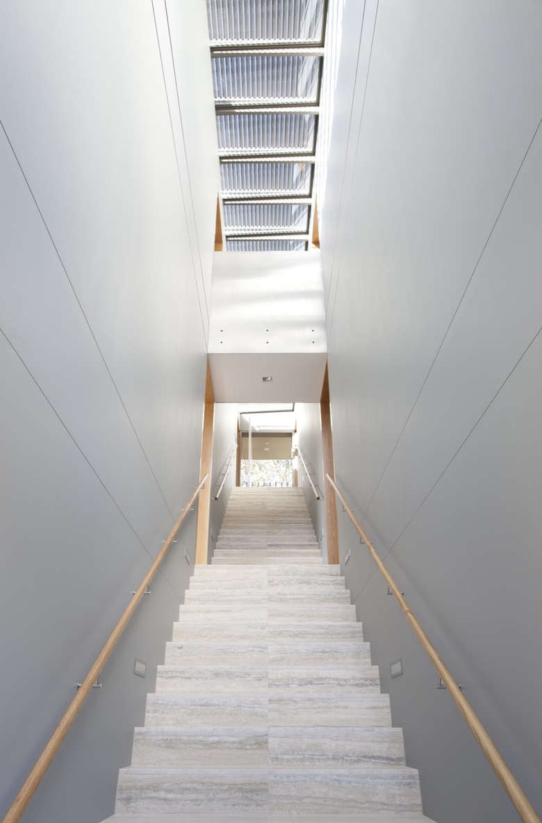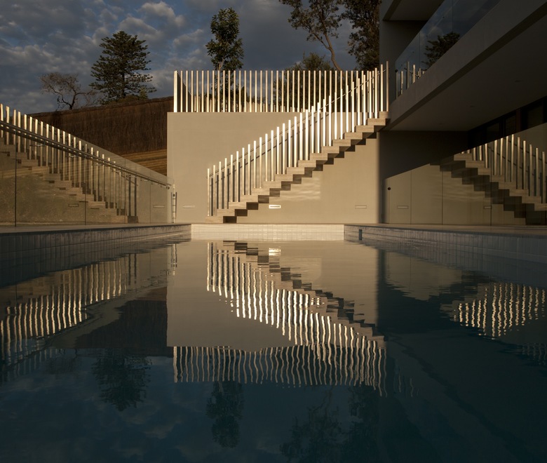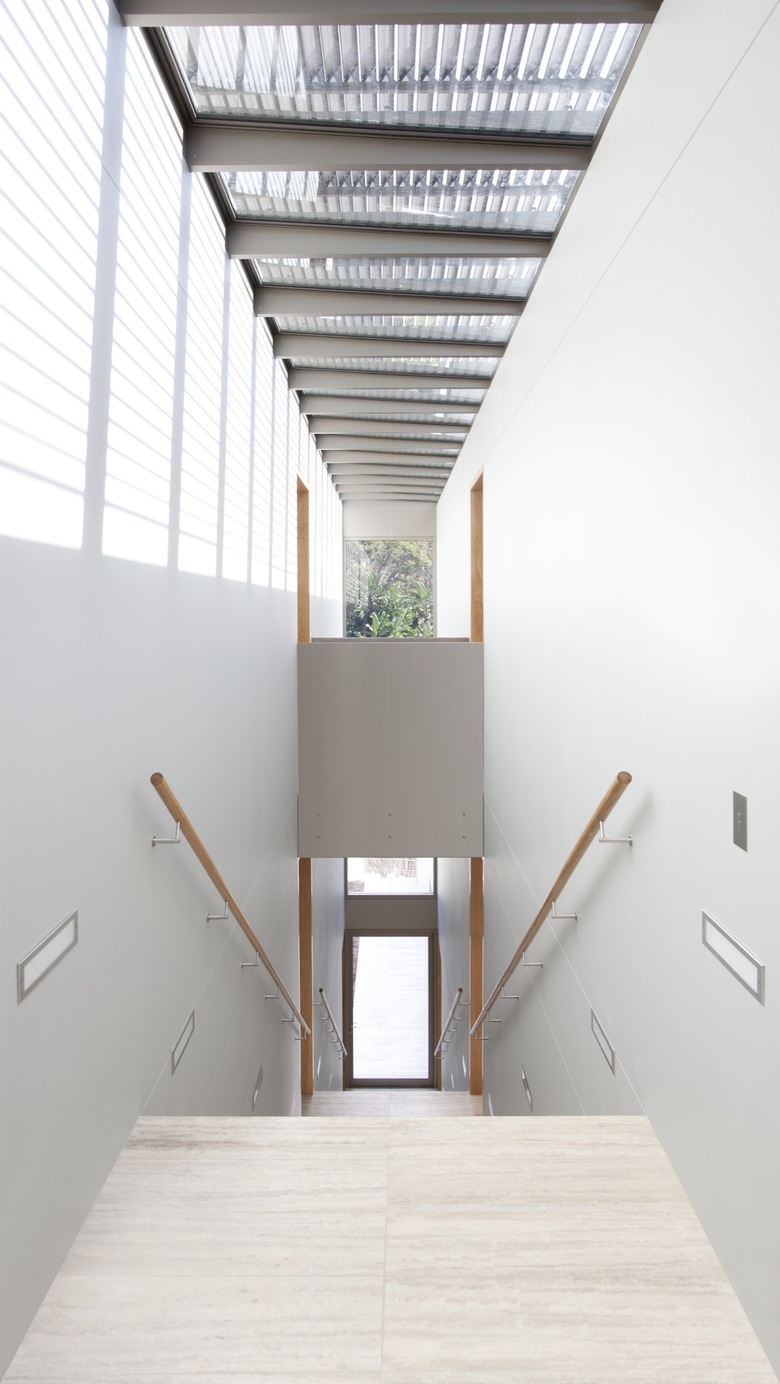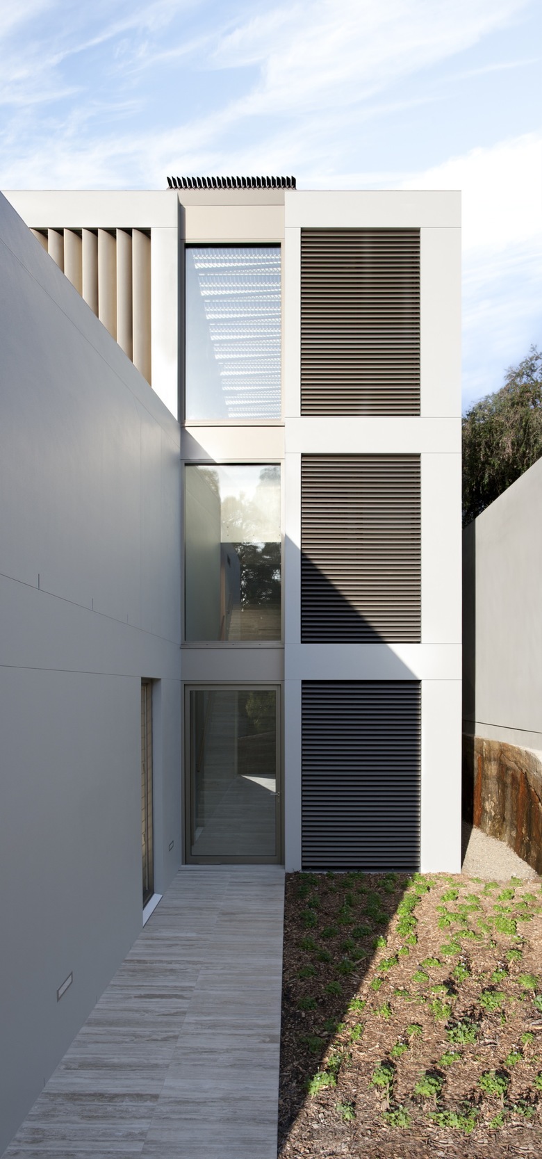 This project is located in Mosman on a north facing slope looking across Sydney's Middle Harbour to the Spit Bridge and Clontarf. The site falls away dramatically from a broad and densely landscaped verge on the street frontage, with a high sandstone cliff forming the southern boundary. The house is nestled into this cliff, shielding it from the street, where it appears as a single storey, focusing attention on the magnificent view to the north. Entry is from the side street across a small bridge to a front door that opens to a grand stair descending the full height of the house and dividing it into two clearly differentiated volumes. The southern volume contains the service spaces, bathrooms, laundry, dressing room and a small study, while the northern volume contains the living areas and bedrooms. The glass roofed stair between these volumes has an ambiguous reading, neither inside nor out. It is only when one passes through a series of Oak framed portals that you are officially inside. The lowest level contains children's bedrooms and a games/TV room that opens to the swimming pool terrace. An undercroft below this level contains the pool equipment and plant room. The middle level contains the main living areas, garage and a large north facing outdoor room opening off the kitchen and dining room. The upper level is given over to the main bedroom suite, home office, study and main entry. The simplicity of the external cement rendered form is enriched with an overlay of light bronze anodised aluminium windows, sliding doors and external sun control louvres, while the interior is defined by the Oak joinery and Travertine floors. The northern elevation is composed of a series of stepped cantilevered roofs and balconies with full height ellipsoid aluminium louvres screening the western facade from the afternoon sun and the neighbouring property.