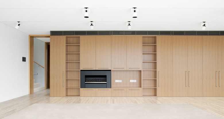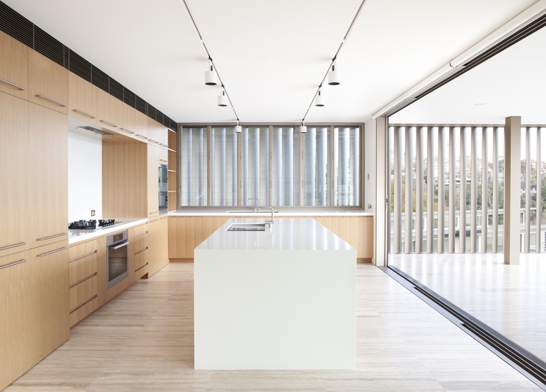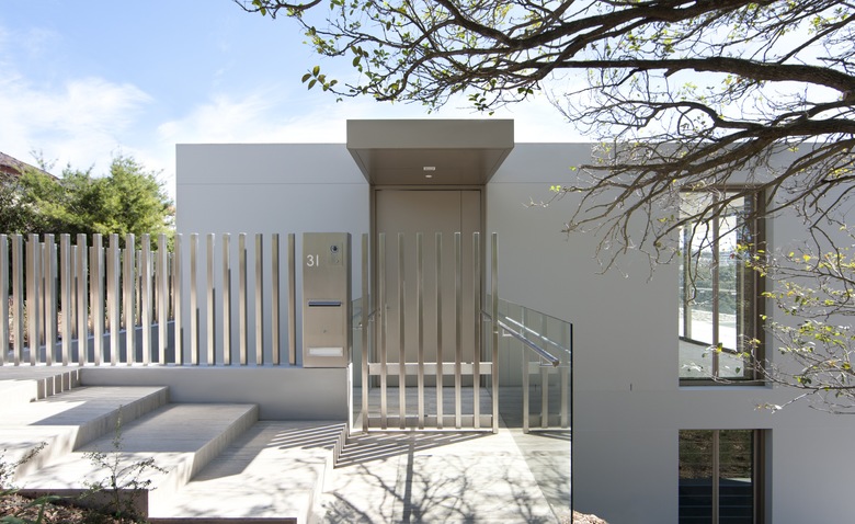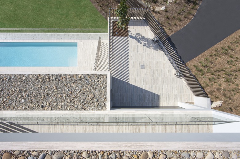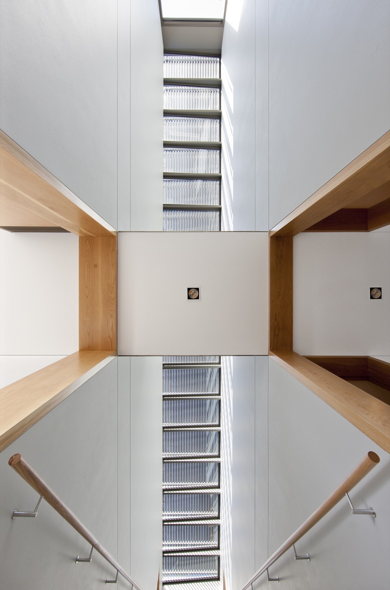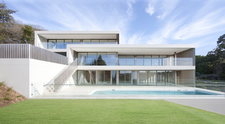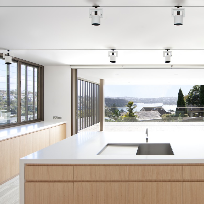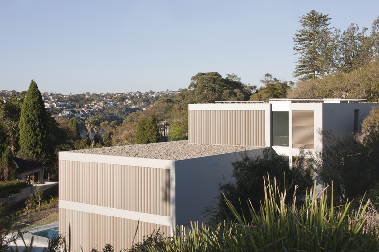 This project is located in Mosman on a north facing slope looking across Sydney's Middle Harbour to the Spit Bridge and Clontarf. The site falls away dramatically from a broad and densely landscaped verge on the street frontage, with a high sandstone cliff forming the southern boundary. The house is nestled into this cliff, shielding it from the street, where it appears as a single storey, focusing attention on the magnificent view to the north. Entry is from the side street across a small bridge to a front door that opens to a grand stair descending the full height of the house and dividing it into two clearly differentiated volumes. The southern volume contains the service spaces, bathrooms, laundry, dressing room and a small study, while the northern volume contains the living areas and bedrooms. The glass roofed stair between these volumes has an ambiguous reading, neither inside nor out. It is only when one passes through a series of Oak framed portals that you are officially inside. The lowest level contains children's bedrooms and a games/TV room that opens to the swimming pool terrace. An undercroft below this level contains the pool equipment and plant room. The middle level contains the main living areas, garage and a large north facing outdoor room opening off the kitchen and dining room. The upper level is given over to the main bedroom suite, home office, study and main entry. The simplicity of the external cement rendered form is enriched with an overlay of light bronze anodised aluminium windows, sliding doors and external sun control louvres, while the interior is defined by the Oak joinery and Travertine floors. The northern elevation is composed of a series of stepped cantilevered roofs and balconies with full height ellipsoid aluminium louvres screening the western facade from the afternoon sun and the neighbouring property.