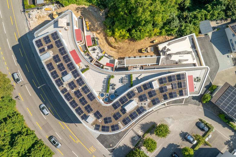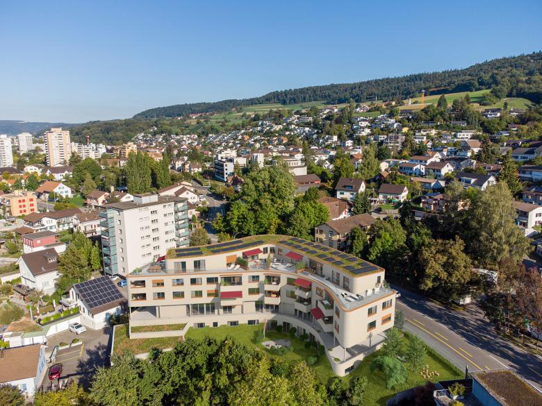 Der natürliche Geländeverlauf des zur Limmat stark abfallenden Grundstücks wirkt durch die Anordnung der Gebäudemasse entlang der Höhenlinien und der daraus resultierenden geschwungenen Form bis in den Strassenraum. Diese Gebäudeanordnung ermöglicht für den grössten Teil der Wohnungen eine lärmabgewandte Ausrichtung der Hauptwohnseite mit schöner Weitsicht zum talseitigen Limmatraum samt optimaler Besonnung. Die im dritten Obergeschoss gelegenen Attikawohnungen profitieren zudem von grosszügigen Terrassen.