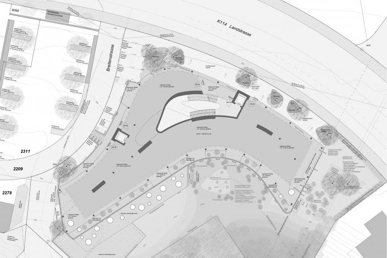 Der geplante neue Baukörper macht einen Bogen von der Landstrasse zur Breitestrasse und begrenzt klar den Strassenraum. Gleichzeitig wird die Abzweigung der Breitestrasse und damit die Zufahrt zum neuen Haus räumlich betont. Die geschwungene Form fügt sich optimal in die Umgebung ein und setzt die bestehende Topographie nach oben hin fort. Mit dem Attikageschoss sind gegenüber den Strassen vier Geschosse sichtbar und das Gebäude verwebt sich als Übergang zum benachbarten dreigeschossigen Haus im Südosten und zum achtgeschossigen Haus im Nordwesten mit der städtebaulichen Situation.