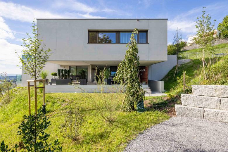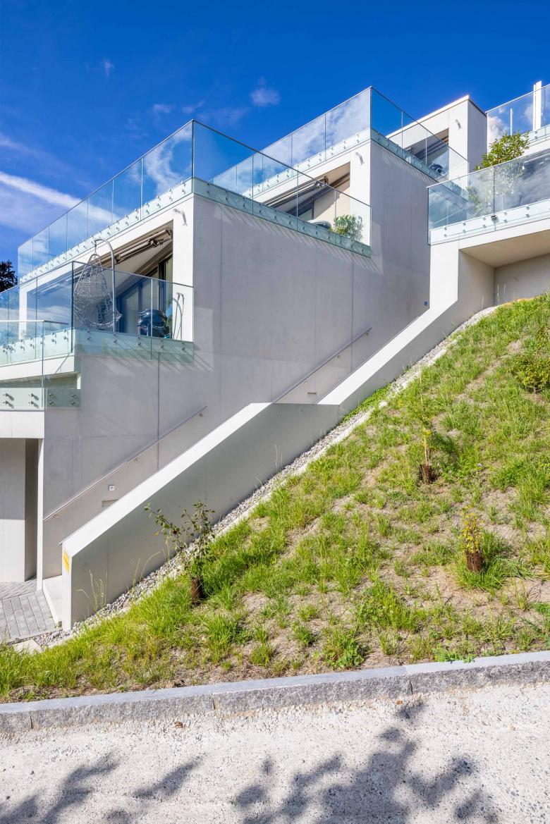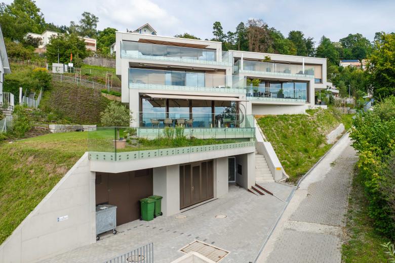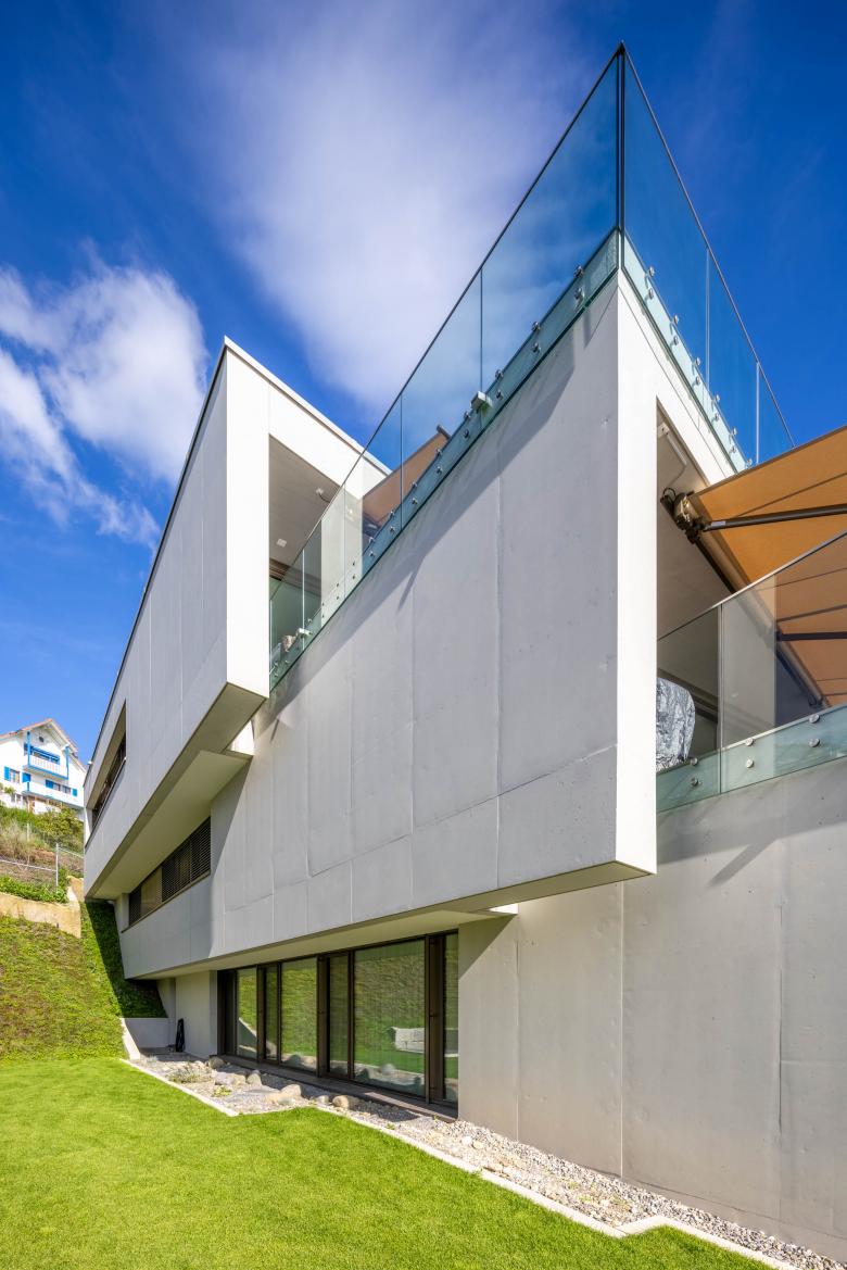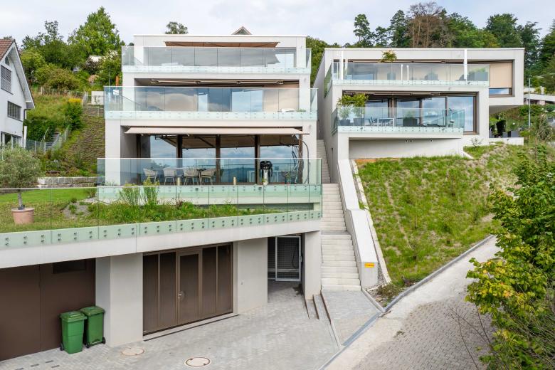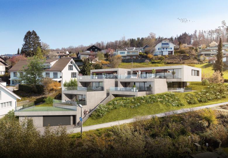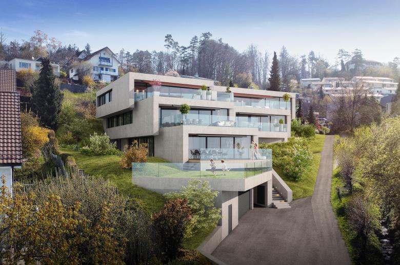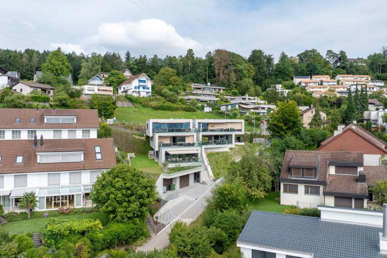 Das exakt in die exklusive Hanglage eingepasste zweiteilige Terrassenhaus besticht durch seine expressive Architektursprache. Die zueinander versetzten, teils zurück gestaffelten, teils auskragenden Gebäudevolumen sind so angeordnet, dass jede der fünf grosszügigen Wohnungen genügend Privatsphäre, eine optimale Besonnung und eine von der herrlichen Fernsicht profitierende Terrasse aufweist.