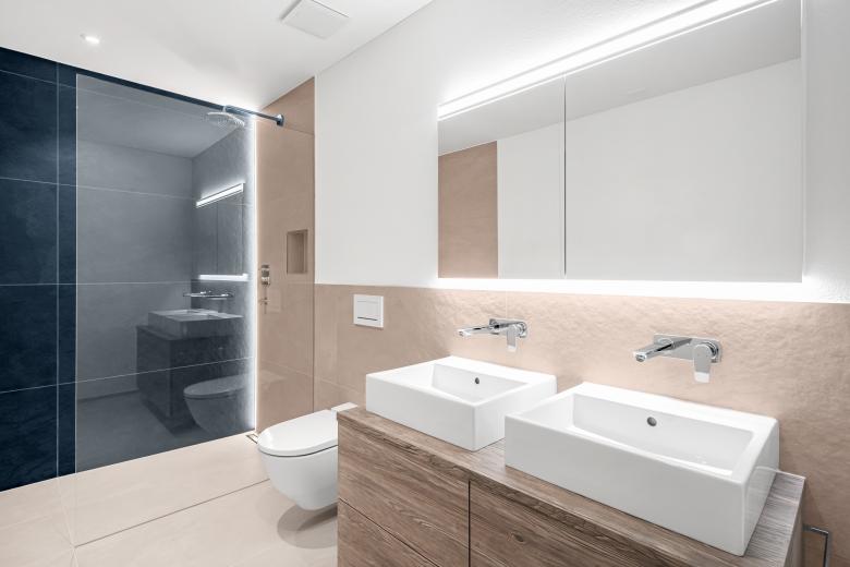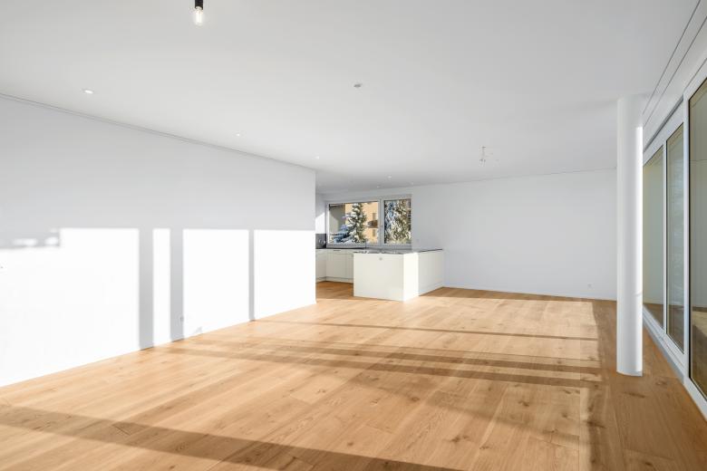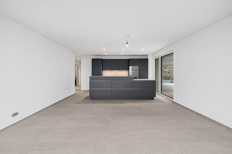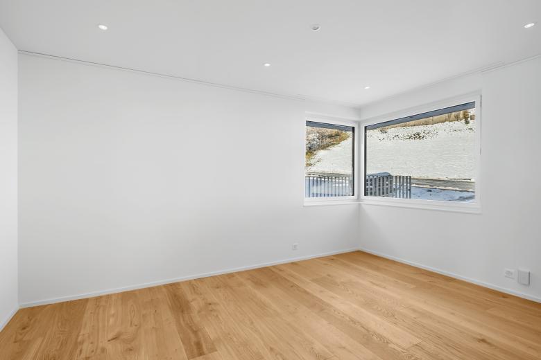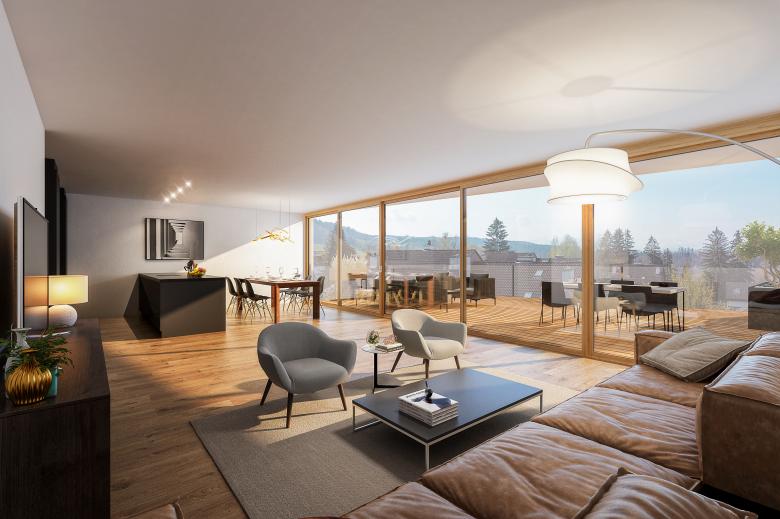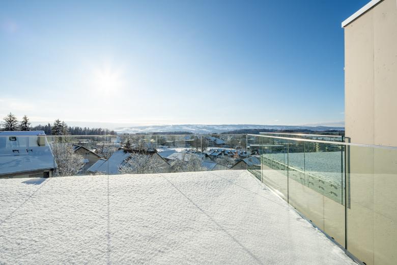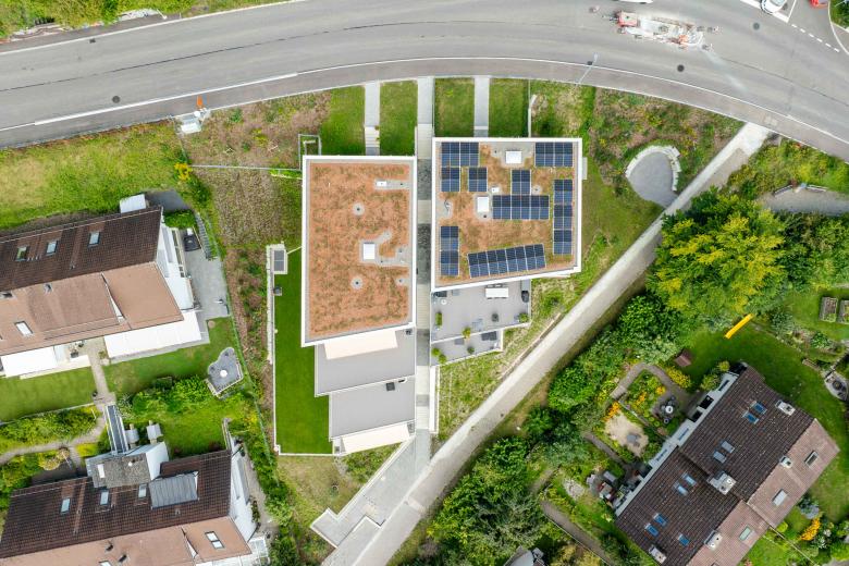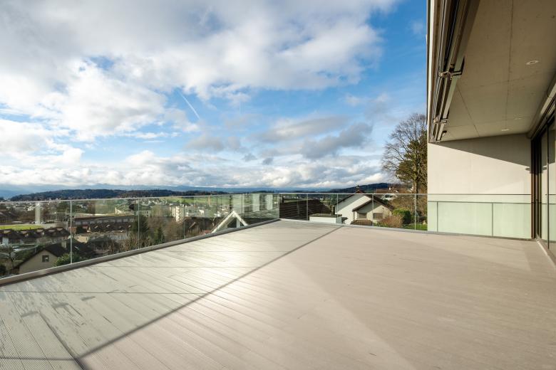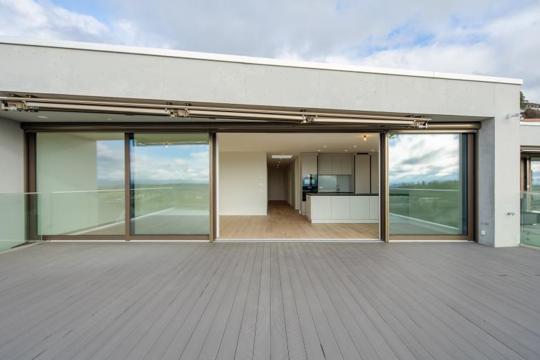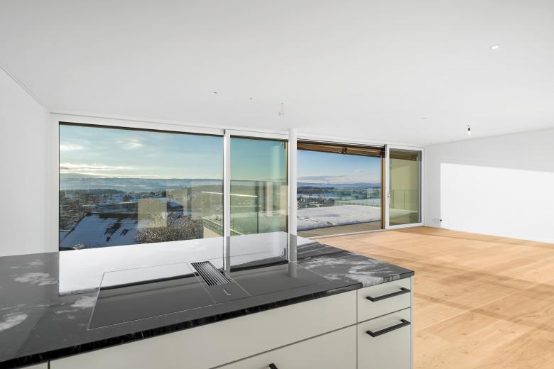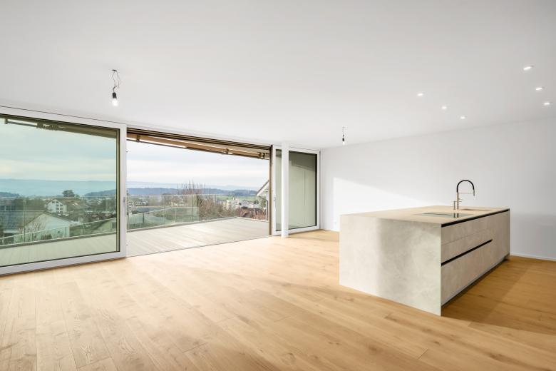 Das exakt in die exklusive Hanglage eingepasste zweiteilige Terrassenhaus besticht durch seine expressive Architektursprache. Die zueinander versetzten, teils zurück gestaffelten, teils auskragenden Gebäudevolumen sind so angeordnet, dass jede der fünf grosszügigen Wohnungen genügend Privatsphäre, eine optimale Besonnung und eine von der herrlichen Fernsicht profitierende Terrasse aufweist.
