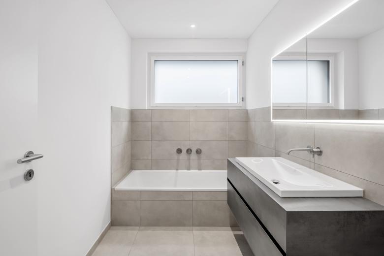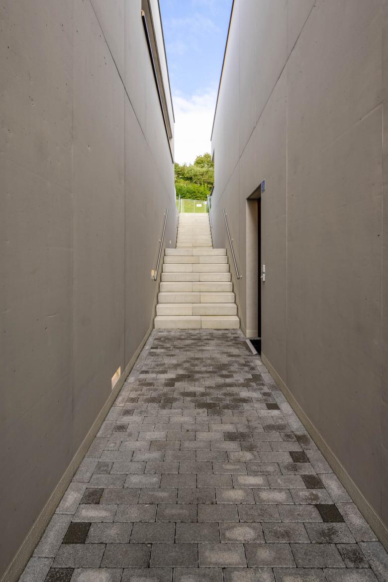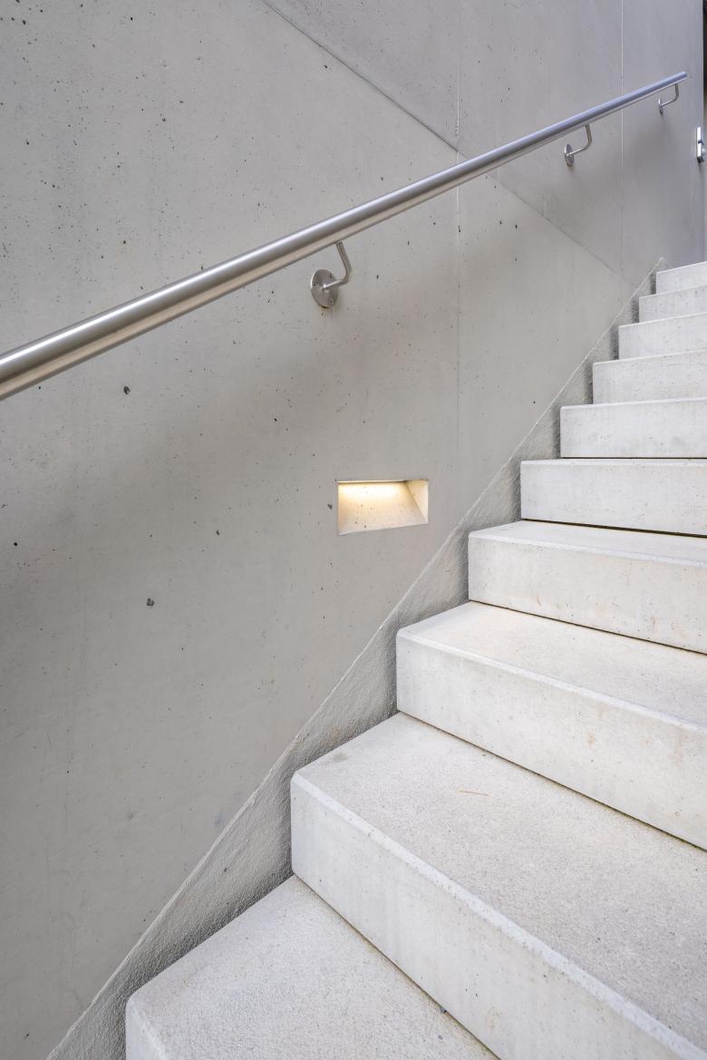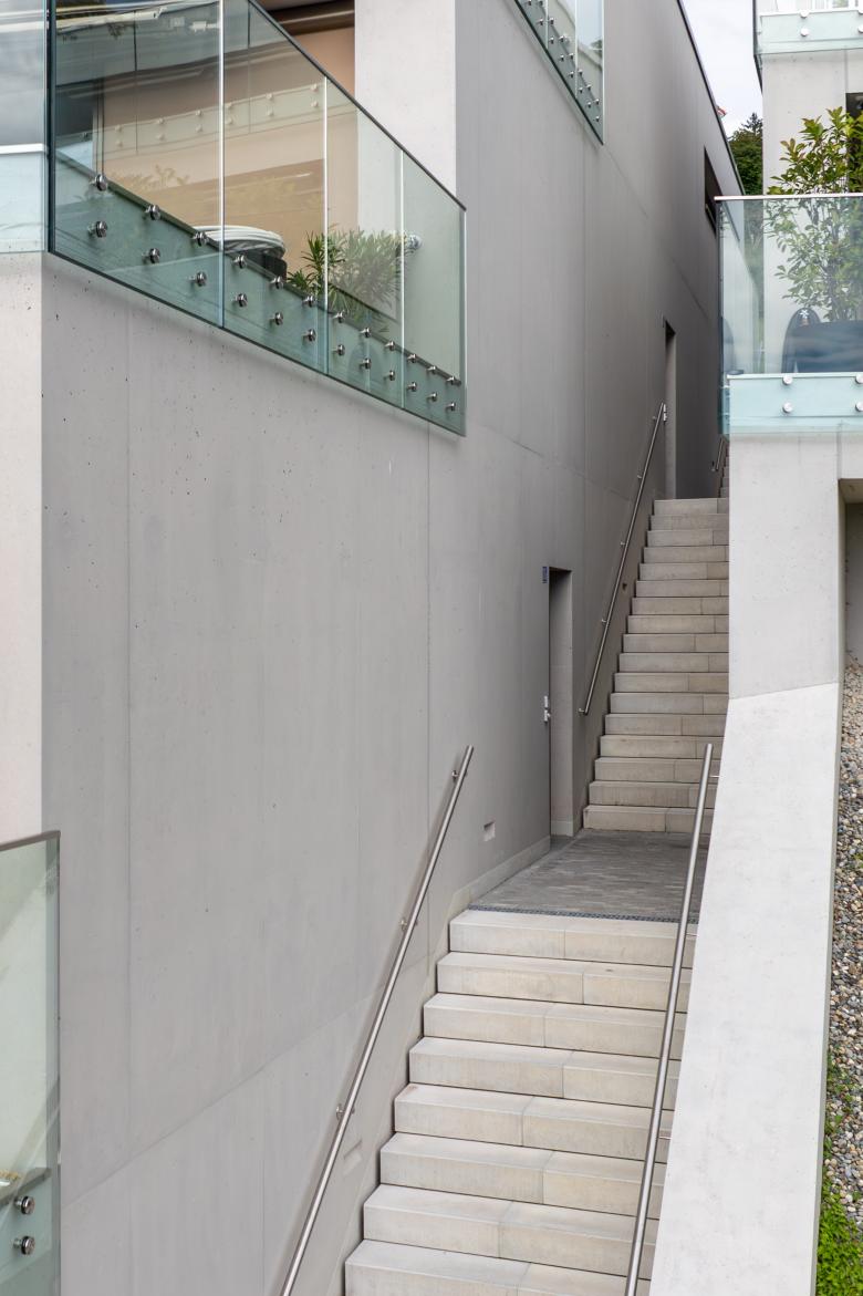 Die Materialisierung der Fassaden in hellem Sichtbeton betont die Eigenständigkeit der im Ausdruck zeitgemässen Architektur. Wenige, dafür teils grossflächige Öffnungen mit Holz-/Metallfenstern lösen die geschlossene Betonschale auf, ohne die spannungsreiche Volumetrie zu konkurrieren. Mit edlen Oberflächen wird die Exklusivität der Wohnungen im Innern betont.