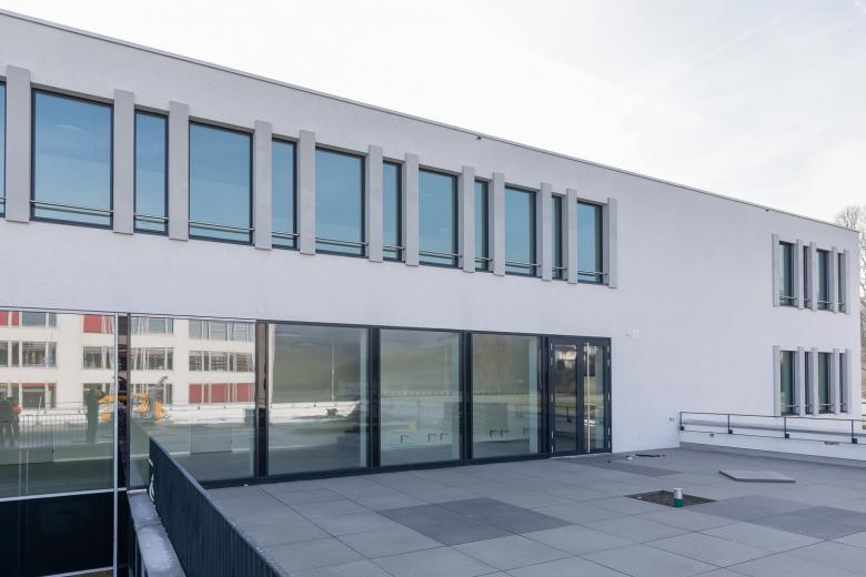 Ein einfaches Grundrisssystem mit einer einhüftigen Erschliessungszone prägt den neuen Baukörper und kann so die geforderten Nutzungen auf kompaktem Raum in sich vereinen. Im „Kopf“ des Gebäudes sitzt ein Mehrzwecksaal, der auch von externen Nutzern bespielt werden kann. Den Bezügen zwischen Innen und Aussen wird besonders grosse Aufmerksamkeit geschenkt.