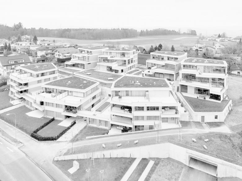 Die ortsbauliche Disposition ist geprägt durch die topographische Situation. Der Ausläufer einer Endmoräne bildet eine Hügelkuppe, um die herum sich die 7 Bauten gruppieren. Dem so hergeleiteten Grundkonzept folgend, sind die einzelnen Baukörper nicht orthogonal, sondern folgen einer freieren Geometrie. Die Abweichungen vom rechten Winkel gehorchen sehr fein den auf die Parzellengrenzen und Sichtbezüge abgestimmten Regeln. Die Erschliessung erfolgt vom Rand her, sodass im Inneren der Überbauung ein Grünbereich als Treffpunkt, Spiel- und Erholungsbereich freigehalten werden kann.