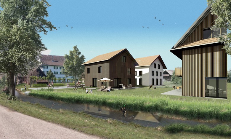 Die unterschiedlichen Baukörper lassen eine Vielzahl von Wohnungs- und Grundrisstypologien zu. Während die Einheiten der 1. Etappe selbst in den Mehrfamilienhäusern Einfamilienhauscharakter aufweisen, finden sich im Dachgeschoss des Mehrfamilienhauses der 2. Etappe Wohnungen mit der Weitläu gkeit von Lofts. Allen gemein ist das grosszügige Öffnungsverhalten gegenüber den Höfen sowie den Grün- und Landwirtschafts ächen.