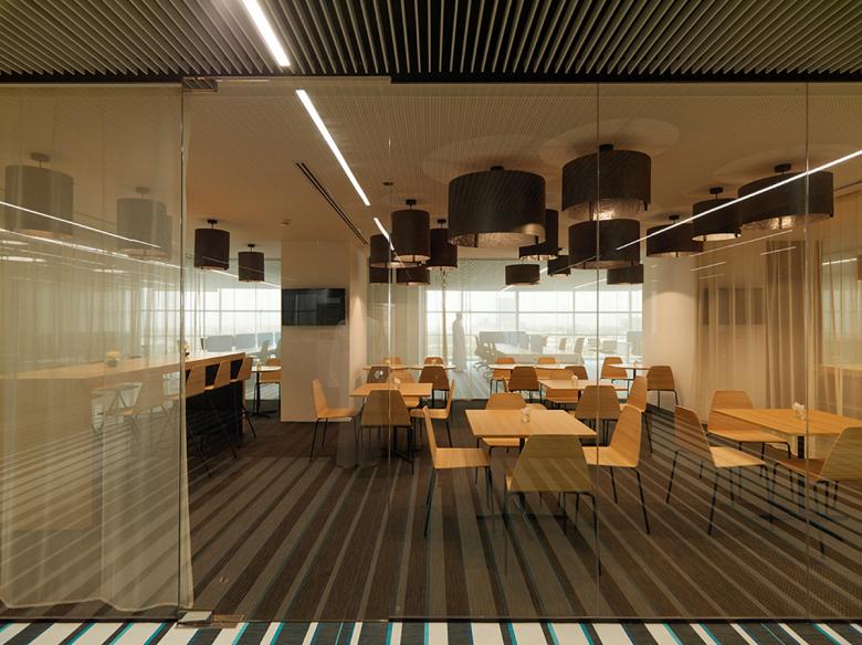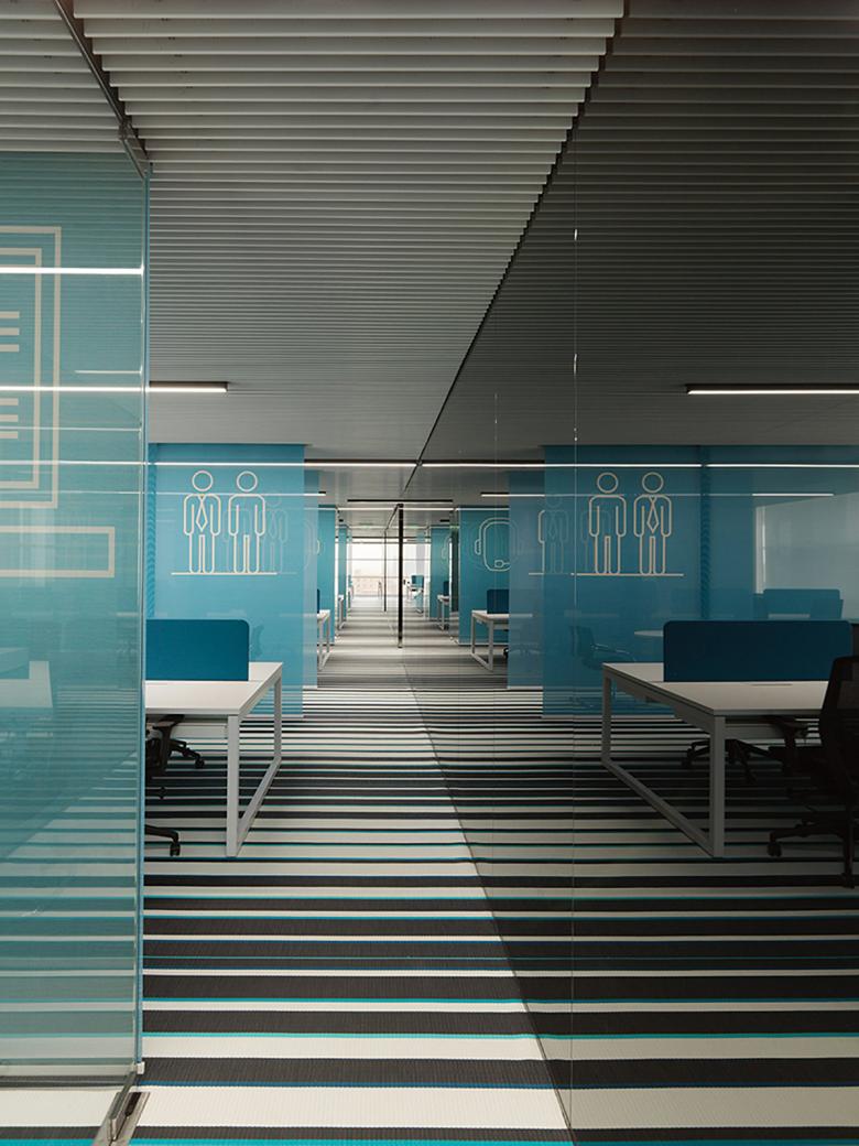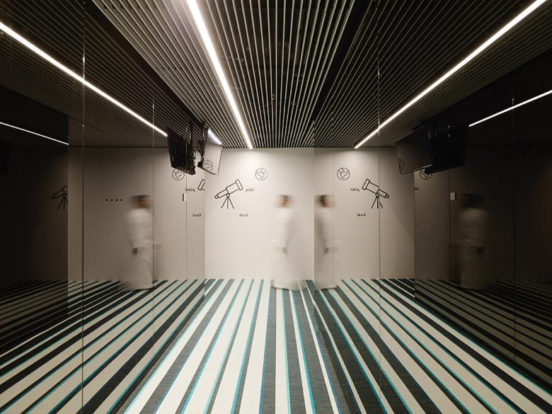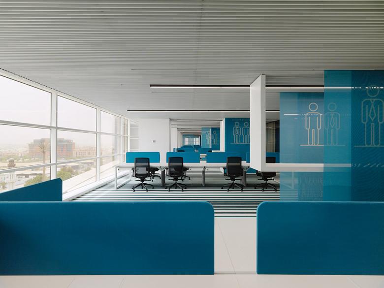 Der offene Arbeitsbereich befindet sich auf beiden Seiten der Fenster und ist mit privaten Enklaven strukturiert, die den offenen Arbeitsplatz zonieren und den Menschen einen vielseitigen Raum bieten, der als Telefonzelle, Medienkiosk, Rückzugsort oder informelles Treffen genutzt werden kann. Ein grafisches Leitsystem, das auf bewegliche Bildschirme gedruckt ist, zeigt die verschiedenen Funktionen der Enklaven und sorgt für Privatsphäre.