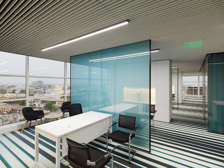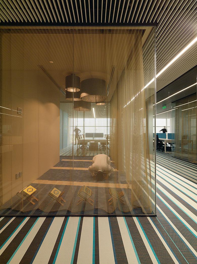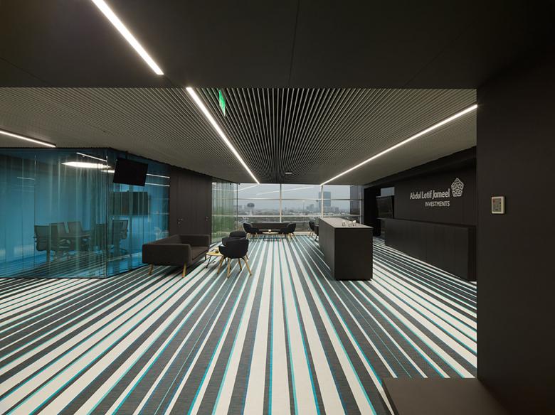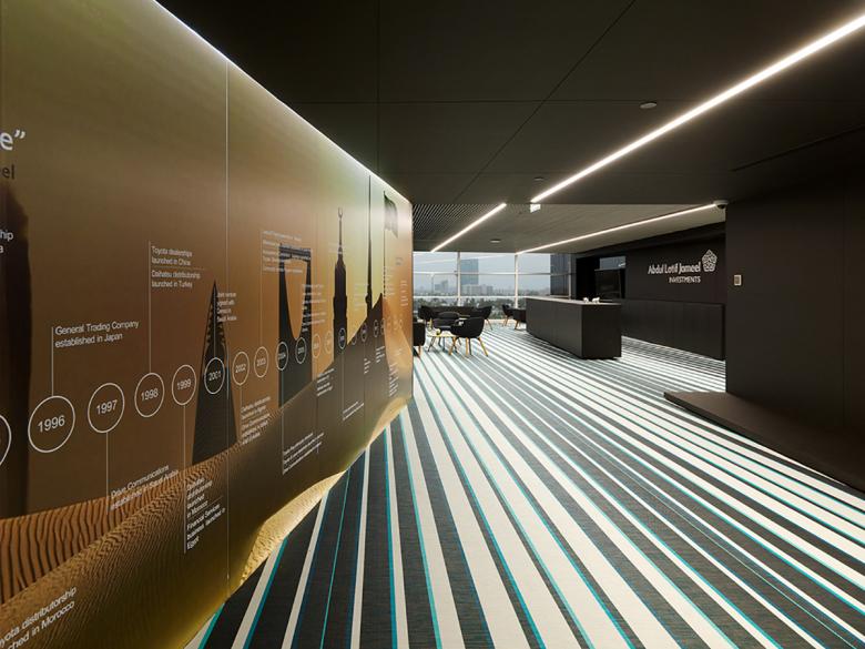 Die Innenarchitektur und Raumplanung für das neue Büro von Abdul Latif Jameel Investments in Jeddah, KSA, folgt den Branding-Richtlinien des Unternehmens. Die Mitarbeiterbereiche unterstreichen die Markenwerte des Unternehmens durch eine Gestaltung, die Transparenz und atmosphärische Qualität betont.