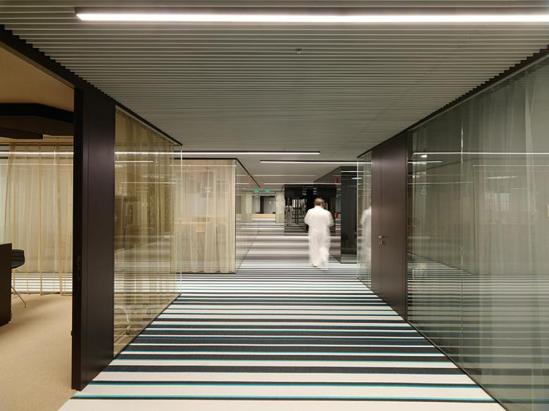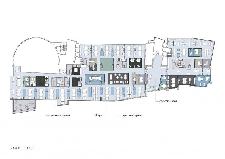 Das Bürokonzept besteht aus drei Hauptkomponenten: „the welcome area“, „the village“ und „the open workspace“. Der Welcome-Bereich verfügt über ein individuelles Display mit Corporate Graphics zur Geschichte des Unternehmens und bietet einen Empfangsbereich, eine Wartelounge, eine Vitrine und einen Kundenbesprechungsraum.