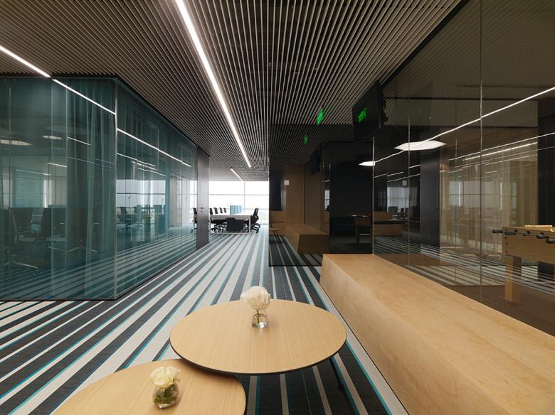 Das Dorf befindet sich in der Mitte des Raums, während alle Arbeitsplätze zu Fenstern hin ausgerichtet sind. Es ist das infrastrukturelle Rückgrat des Büros und die Hauptbewegungsfläche.