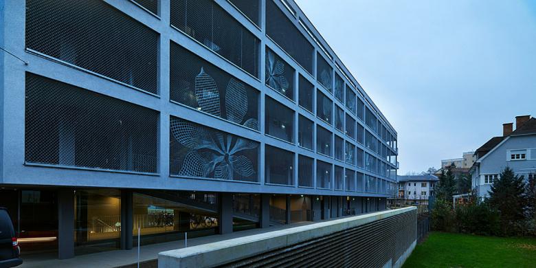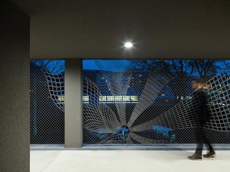Die Drahtgitterfassade mit ihren eingeflochtenen Mustern greift den Raster der Fenster und das Bildmotiv der Kastanie auf, das einst das Bestandsgebäude als Stuckrelief zierte und übersetzt dieses in ein großflächiges Muster.