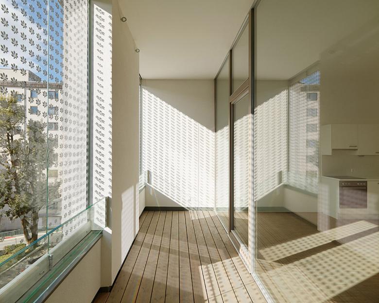 Als Sonnenschutz interpretiert ist die Kastanie ebenso auf den Glasfaltläden der in den Bestand eingeschnittenen Loggien, die sich mit den Wohn- und Schlafräumen, zu einer Einheit verbindet.