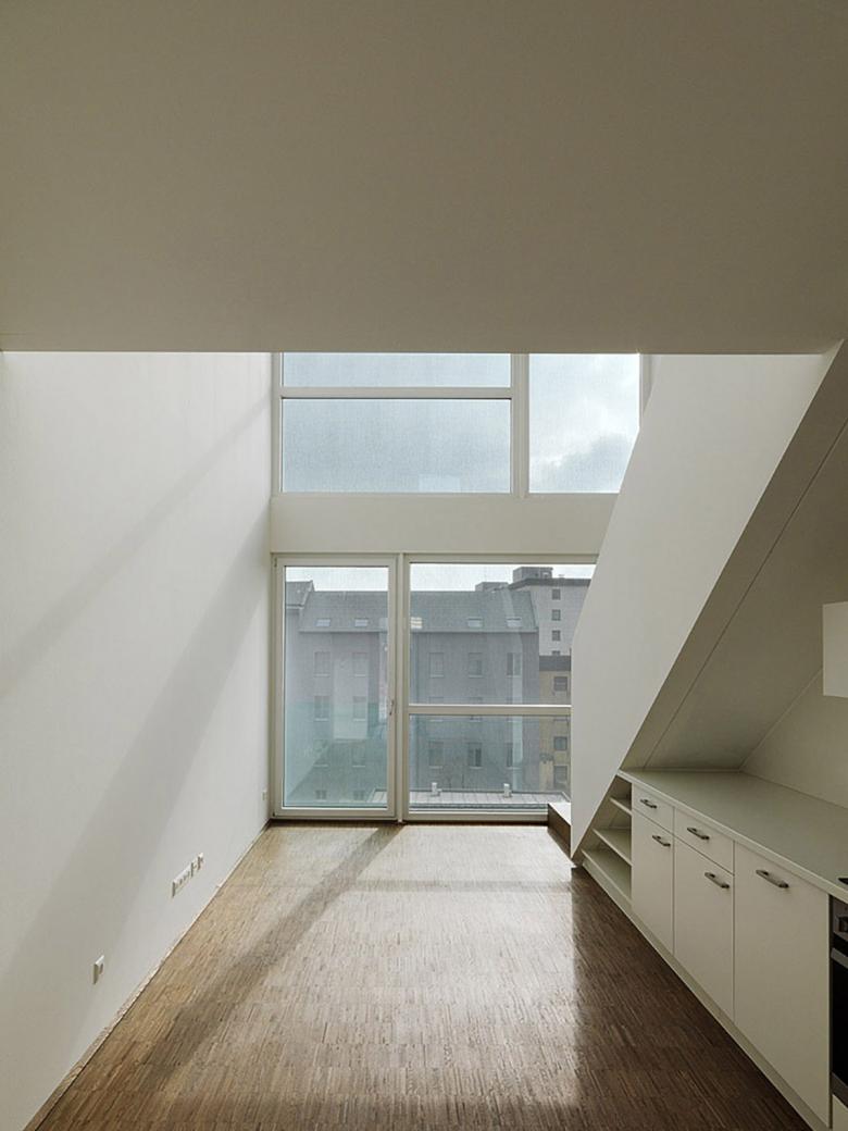 Beinahe vollflächig verglast öffnet sich die Innenhoffassade des Neubaus und verzahnt sich mit den Loggien, Balkonen und den Dachterrassen mit dem Außenraum. Screens lassen die Wohnungen schließen und erzeugen in der Nutzung ein Spiel von offenen und geschlossenen Flächen.