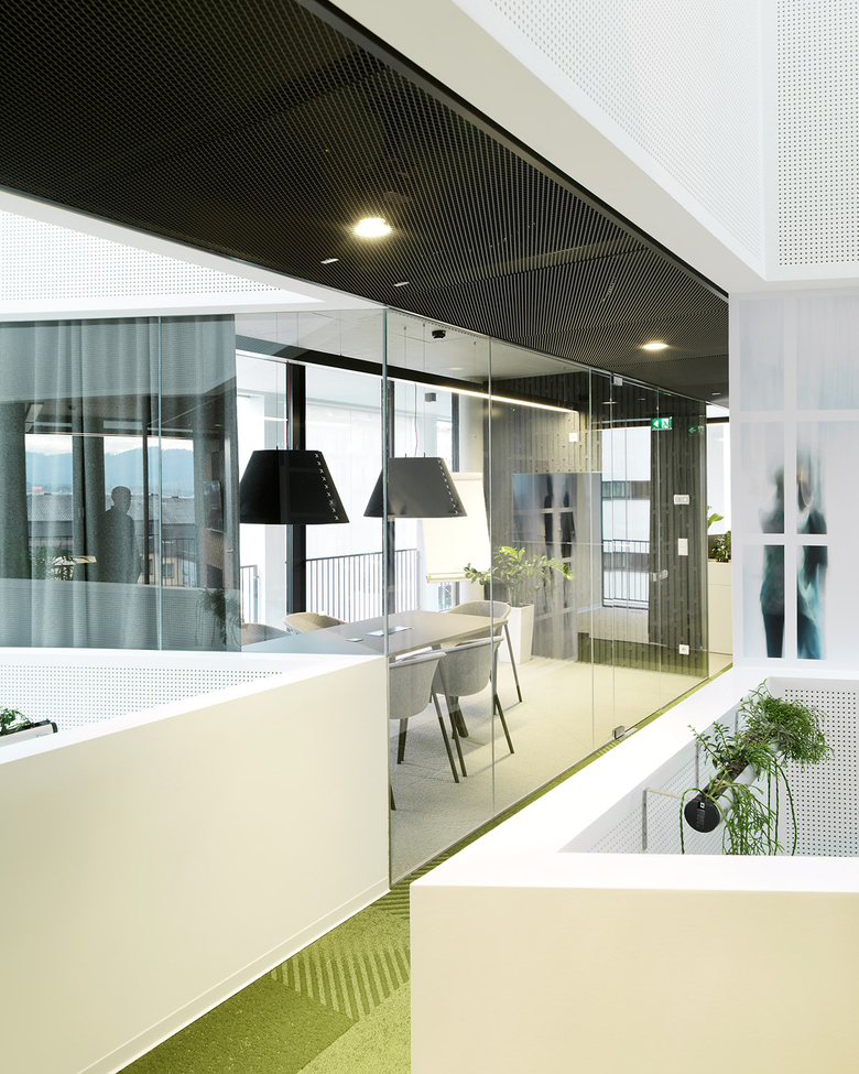 Zwischen dem symmetrischen Fassadenraster und dem transparenten Bürogebäude entstehen auf jedem Geschoss rund umlaufende, individuell verwendbare Freibereiche. Das Erscheinungsbild des Gebäudes verändert sich durch textile Sonnenblenden, welche die Dynamik des Tageslichts und der Nutzer abbilden. Die innenräumliche Gestaltung reflektiert das „New Work“ Konzept, dessen Funktionen, wie gemeinsam genutzte Einrichtungen sowie Arbeits- und Rückzugsorte, um den sich konisch erweiternden Lichthof, als vertikalen Kommunikationsraum vom Erdgeschoss bis zum Dachgarten, organisiert sind.