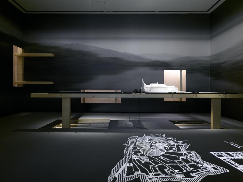 Als Projektionen legen sich die Strukturen auf den Boden und bilden Dorf- und Stadtpläne ab. Der Besucher durchschreitet Gebäudetypologien und wird selbst Teil davon – Wegenetze und Verwaltungsstrukturen schreiben sich in den Raum ein.