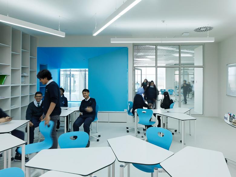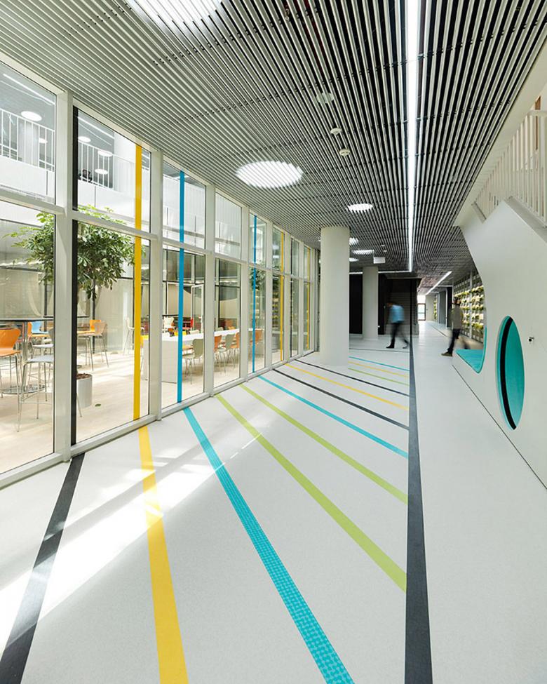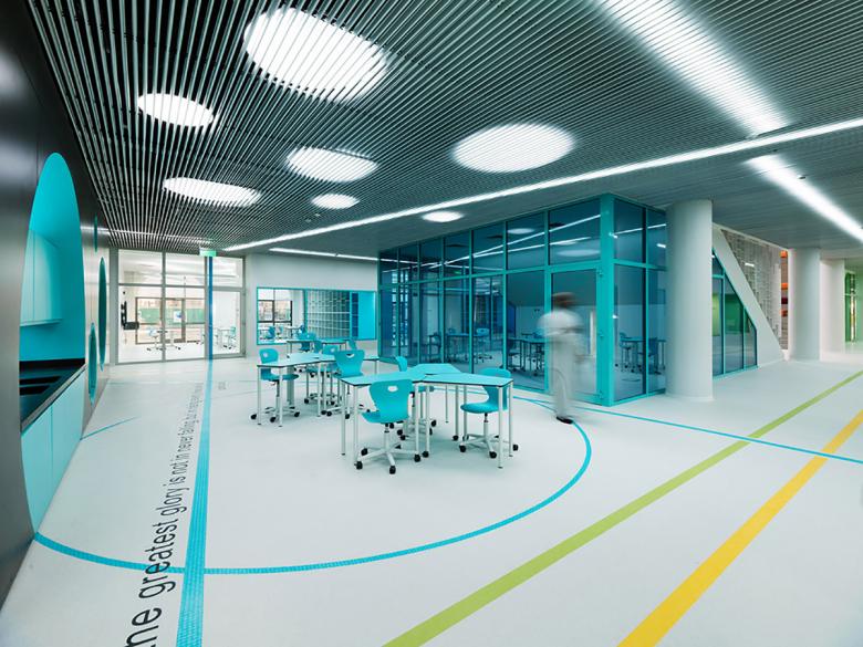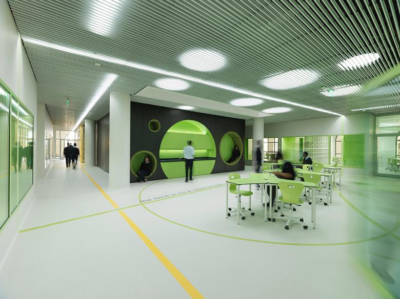 Der Hauptflur „the connection“ bietet offene Kommunikation mit unterschiedlichen Grundrissen. Entlang des Flurs befinden sich häufig genutzte „Wir-Plätze“, Bereiche für Sonderpädagogik, darunter ein Design- und Techniklabor mit Arbeitsplätzen, ein Vorbereitungsraum und Robotik.