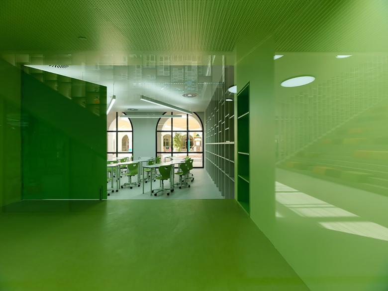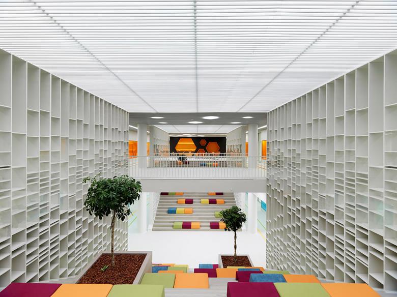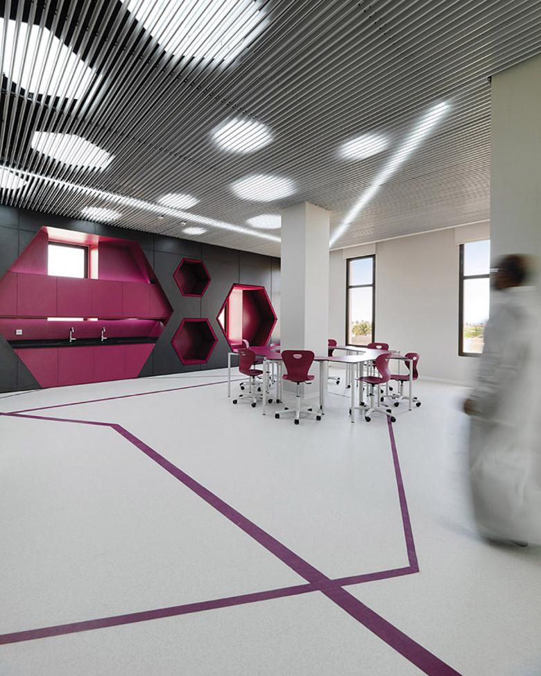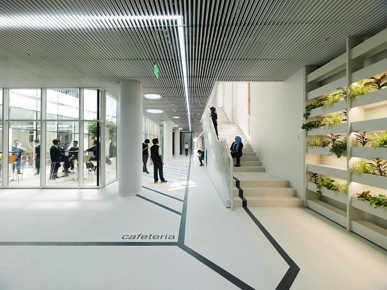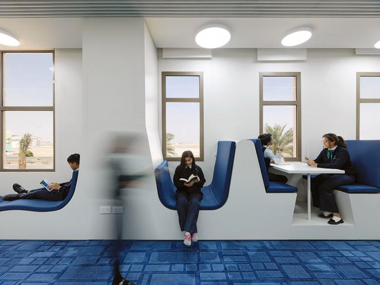 Die „Life Skills & Entrepreneurship Center“ ist ein Mehrzweckbereich für Gruppenunterricht, Vorlesungen und individuelles Lernen. Jedes Cluster hat in seinem Inneren einen bestimmten Farbcode, der die Zugehörigkeit symbolisiert und die Vielfalt der Studenten widerspiegelt.